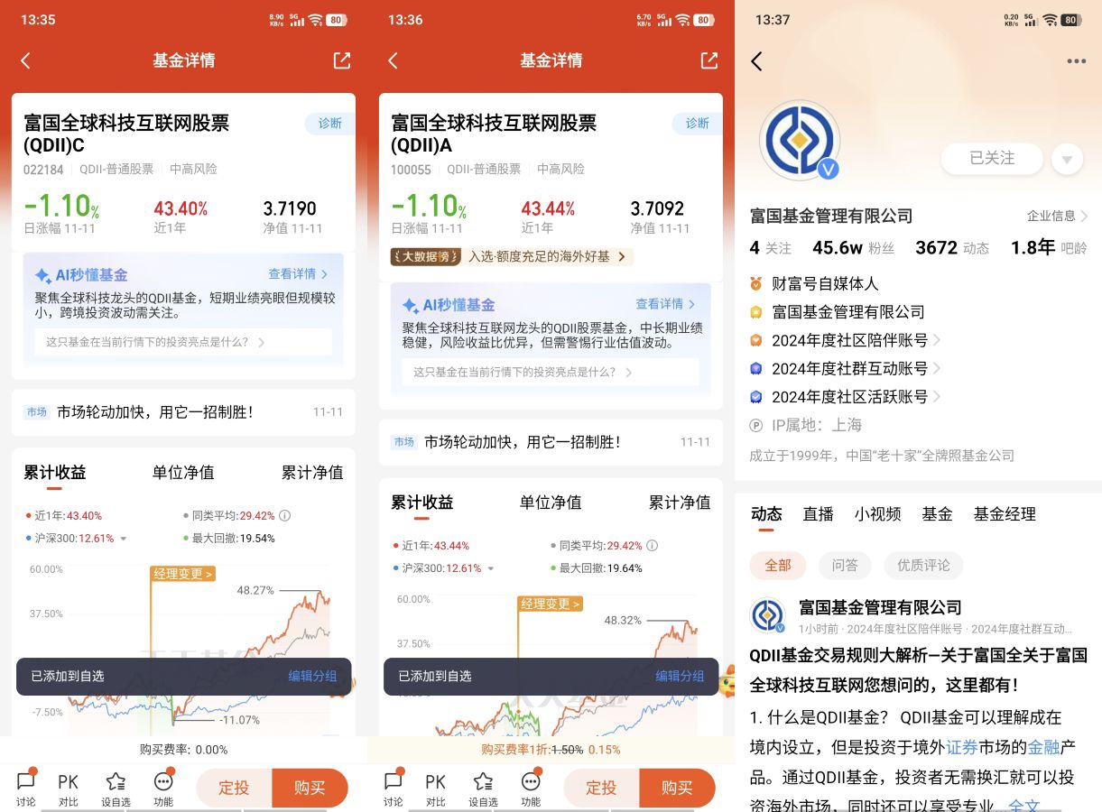 而$富国全球科技互联网股票(QDII)C$正好解决布局全球科技的这些顾虑。对普通投资者来说,直接投资海外科技股门槛高、操作复杂,还得在海量标的里“大海捞针”,纠结“选美股还是港股”;这只基金就像“全球科技优质标的的一站式配置工具”,既重仓了英伟达、谷歌这些美股技术龙头(对应AI算力、底层研发的硬红利),也纳入了腾讯、阿里巴巴这些港股应用核心企业(对应AI落地、区域市场的增长),一键覆盖“研发-应用”全链条,不用我们费心筛选个股。从业绩来看,截至2025年10月31日,它近1年收益率达46.37%,跑赢不少主流科技指数,验证了布局的有效性;更重要的是,它暂未限额,我们不用面对跨境投资的繁琐流程,就能轻松搭上全球科技的“成长快车”。