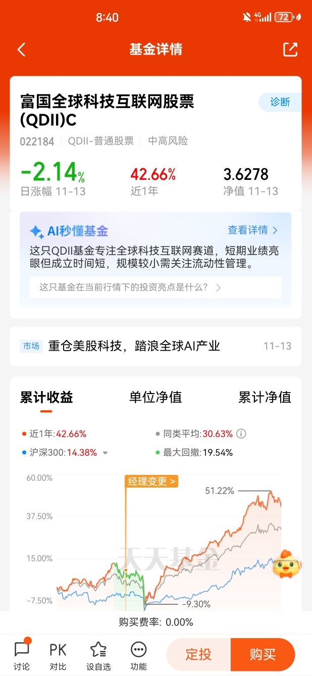 不过昨日该基金出现了2.14%的日度回调,这更多是前期反弹后的获利盘兑现,并非赛道逻辑走坏。我打算先小仓位定投入场,定投频率设为每周一次,既能分享全球科技的长期红利,也能靠定投平滑短期波动;后续如果板块回调到前期支撑位,会再小幅加仓,整体仓位控制在我权益类资产的15%以内,避免单一赛道占比过高。@富国基金管理有限公司