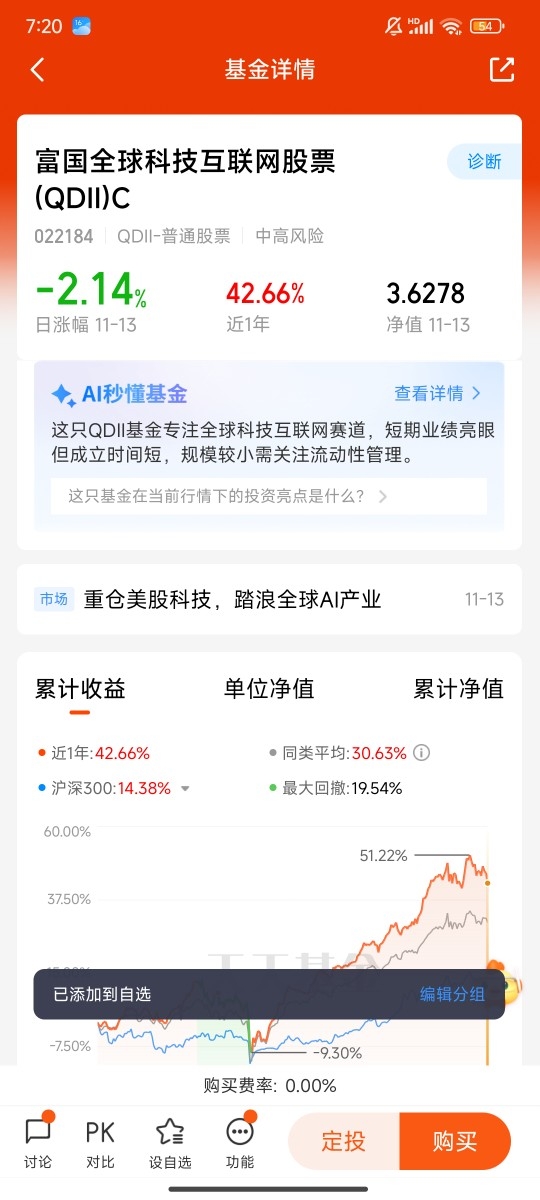打开行情软件,纳斯达克指数单周超3%的跌幅刺得人眼睛发紧,AI八巨头一周蒸发近万亿美元市值的新闻铺天盖地。英伟达单周跌超7%,市值缩水3500亿美元,微软、Meta等龙头纷纷跟跌,市场上“科技泡沫破裂”“美股要暴跌”的声音越来越响。身边不少朋友开始恐慌抛售,甚至有人劝我赶紧赎回持有的科技类基金,但我却在这种普遍的焦虑中,悄悄关注起富国全球科技互联网股票C。