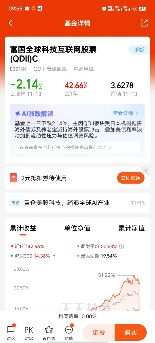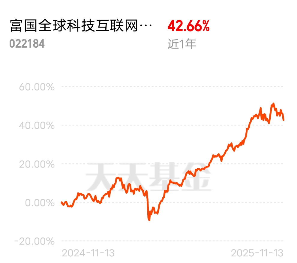 对于美股科技我是一直长期看好的,因为美股有着成熟的投资市场,市场中投资股票的机构占大多数,散户占少数,而且他们已经养成了长期投资的好习惯,看看代表美股科技的纳指近十年的表现就知道了,它的表现有多好,国内这边由于有额度限制,所以我们可以选择$富国全球科技互联网股票(QDII)C$ 这类型基金,也可以投资美股科技。该基金近一年上涨了42.66%。今年已上涨40.89%。表现丝毫不弱于纳指。@富国基金管理有限公司