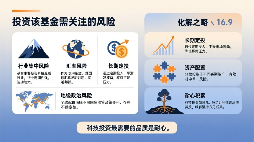 一是行业集中风险,基金主要投资科技互联网行业,行业波动较大;二是汇率风险,QDII基金受汇率波动影响;三是地缘政治风险,全球配置面临不同市场监管环境变化。