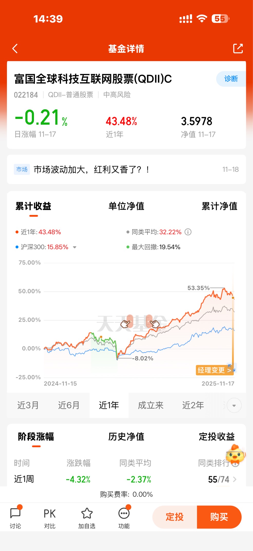 目前美股调整,但英伟达财报在即、谷歌Gemini3刚发布,科技趋势没变。富国全球科技互联网C全押腾讯、台积电、微软等龙头,回撤修复快,低位分批布局心里稳扎稳打。