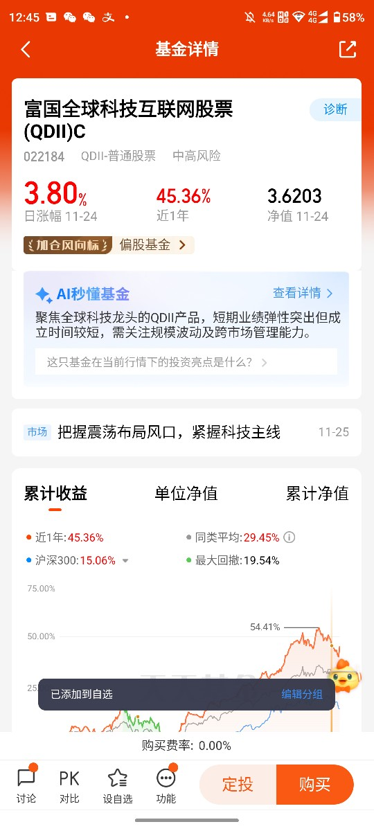 再谈配置时机:当前全球科技互联网正处于“估值洼地+产业趋势”的黄金共振期。从行业来看,AI技术爆发式发展贯穿全产业链,中美科技巨头持续加大研发投入,资本开支保持高增速,从算力硬件到应用落地,全链条都在迎来价值重估。而富国这只QDII-C精准覆盖全球优质科技互联网资产,既囊括美股科技龙头,又涵盖海外上市的中国互联网核心企业,完美契合AI商业化浪潮。从产品表现看,截至11月24日,其近6个月涨幅达29.32%,近12个月涨幅更是高达45.36%,在市场震荡中展现出强劲的盈利能力,这种“产业景气+业绩支撑”的组合,正是当前配置的核心逻辑。
