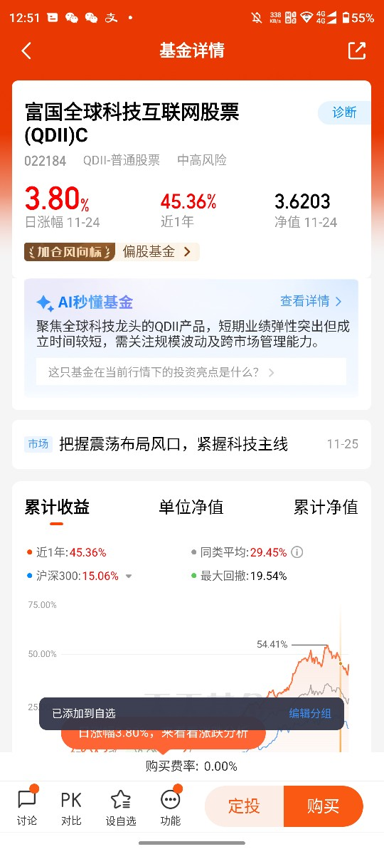 最后提醒几句:富国基金本身有丰富的海外投资经验,这只基金聚焦全球科技互联网龙头,标的靠谱,规模也够大,不用担心清盘风险 。但它是中高风险产品,短期波动肯定存在,不能指望买了就涨。如果你的风险承受能力不高,或者只能持有几个月,建议谨慎考虑;如果能接受短期波动,看好全球科技的长期趋势,现在布局正合适。