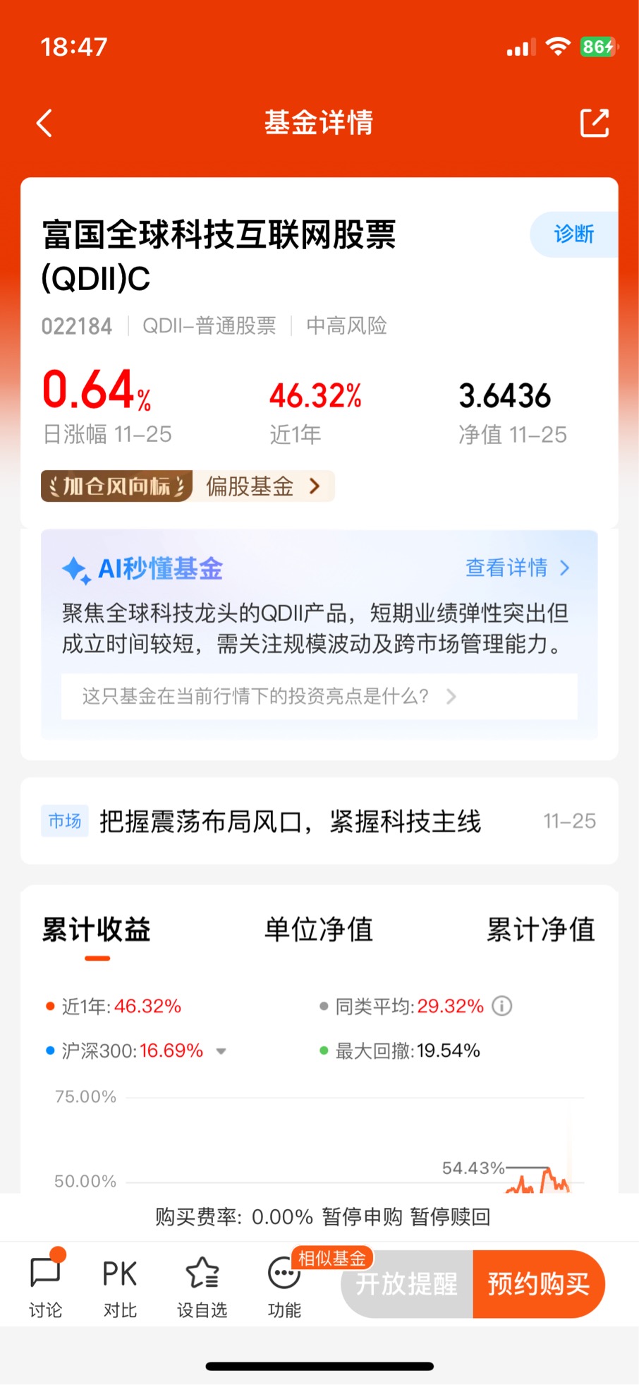顺带提一下,主动型基金,富国全球科技互联网股票(QDII)C(022184)今年表现较好,年内收益超40%,这个是投资全球科技与互联网行业的主题基金,美股和港股为主。感兴趣的投资者可以留意一下。@富国基金管理有限公司