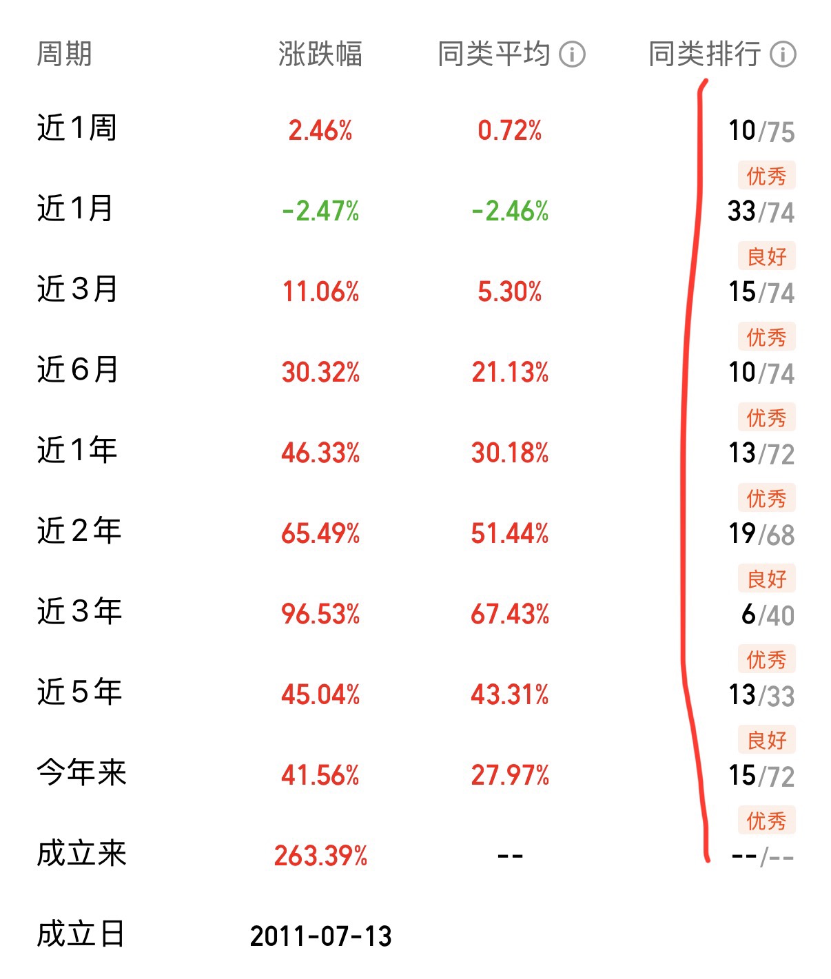 从富国全球科技互联网股票(QDII)基金本身的业绩表现来看,也确实非常亮眼,给了我一些持有的底气。自2011年七月份成立以来,它的A类份额累计收益率达到了263.39%,轻轻松松跑赢业绩比较基准9.18%,超额收益率高达254.21%。从中短期看,近一年、半年、三个月的收益率分别为46.33%、30.32%、11.06%,不仅都大幅度跑赢了同期的纳斯达克100指数,而且在同类基金中都稳居【优秀】评级。可以说,这是一只历史业绩优秀、近期表现突出的QDII主动管理型基金。