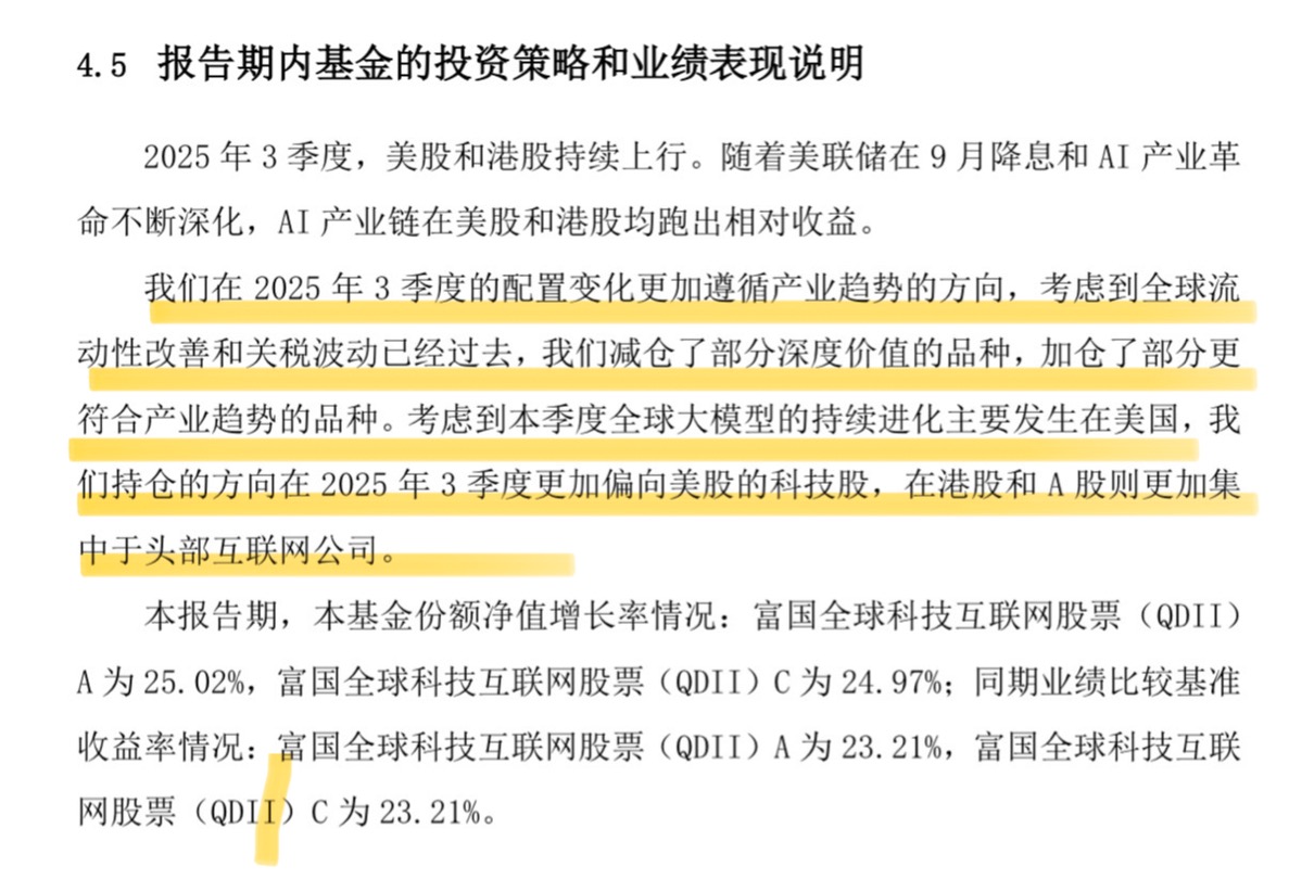 当然,买主动管理型基金,说白了很大程度上就是“买”基金经理这个人,看他的眼光准不准,定力够不够。所以我个人特别看重基金定期报告里那个“报告期内基金投资策略和运作分析”的部分。这就像基金经理的“工作笔记”和“思想汇报”,能看出他是不是真的知行合一,说到做到。富国这只基金的赵宁坤经理在2025年三季报里就写得明明白白:“我们在2025年3季度的配置变化更加遵循产业趋势的方向,考虑到全球流动性改善和关税波动已经过去,我们减仓了部分深度价值的品种,加仓了部分更符合产业趋势的品种。考虑到本季度全球大模型的持续进化主要发生在美国,我们持仓的方向在2025年3季度更加偏向美股的科技股,在港股和A股则更加集中于头部互联网公司。”