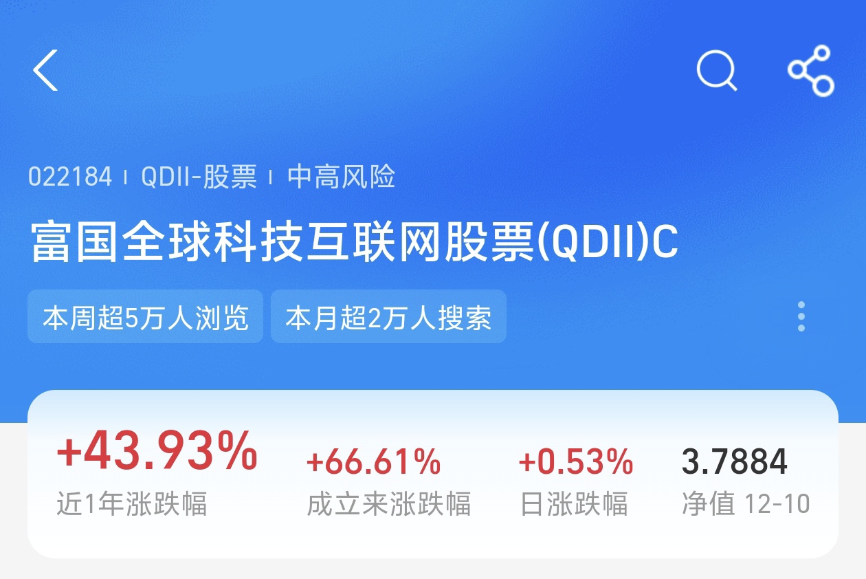 行情震荡,昨晚行情小幅回落。今天我也是加仓了$富国全球科技互联网股票(QDII)C$ +1000元,基金近期表现的也是非常的优秀,近6个月上涨了29.27%,近一年的收益率高达43.93%,盈利能力强。是一只全球布局的基金,降低了单一市场波动的风险。基金持有腾讯、阿里巴巴、英伟达、微软、特斯拉、苹果等科技龙头企业,基金上涨。弹性大,爆发力强。目前全球互联网板块呈现出AI驱动、美联储降息增加市场流动性利好等多重共振态势。AI全方位赋能核心业务,相关互联网企业营收、净利润大幅增长。将迎来新一轮的上涨周期,长期持有,投资回报率高。