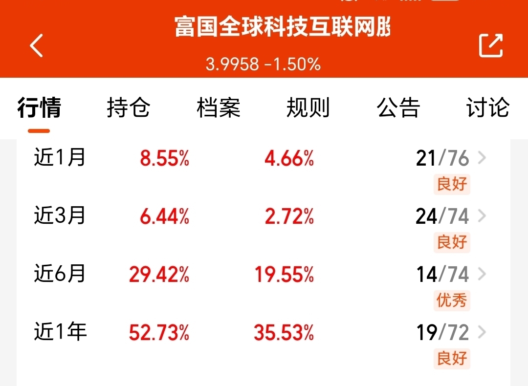 最近科技股经历了一大波反弹后有些震荡,我发现布局全球科技还挺抗跌的,我持有的$富国全球科技互联网股票(QDII)C$ 近一周没有亏钱,近一个月涨超8%,近六个月涨超29%,近一年涨近53%,我目前已经盈利3.51%了,弹性还是不错的,长期持有的话收益也挺可观 。