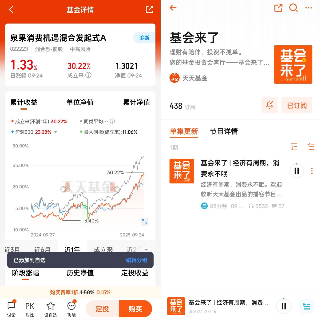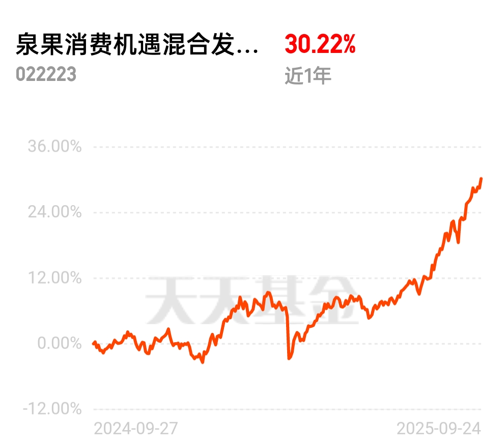 #牛市消费怎么买?# $泉果消费机遇混合发起式A$2025年4月7日以来,A股慢牛行情持续演绎,消费板块凭借政策托底与需求复苏的双重支撑稳步上行,其中新兴消费以高景气度成为市场焦点,而传统消费则在估值洼地中酝酿修复动能。在此背景下,聚焦消费赛道的泉果消费机遇混合A(022223)凭借“新旧融合”的配置策略脱颖而出,截至2025年9月24日,近6月净值增长21.59%,跑赢同期业绩比较基准,解答了“传统消费+新兴消费还能投吗”提供了实践样本。