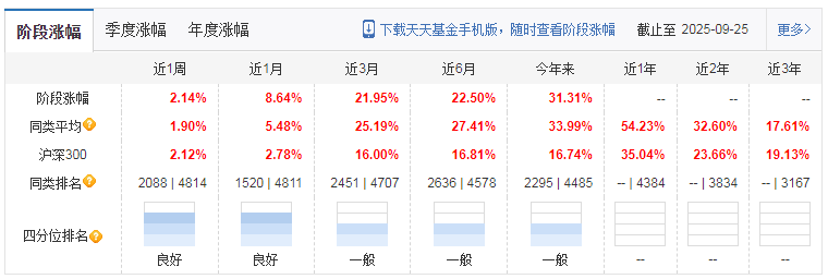 从基金业绩表现来看,泉果消费机遇混合发起式A基金自成立以来取得了稳健的回报。截至2025年9月25日,该基金近半年回报达22.50%,跑赢基金比较基准增长率(2.73%),在混合型基金中排名前15%。这一业绩表现充分证明了该基金的投资策略与理念的有效性。