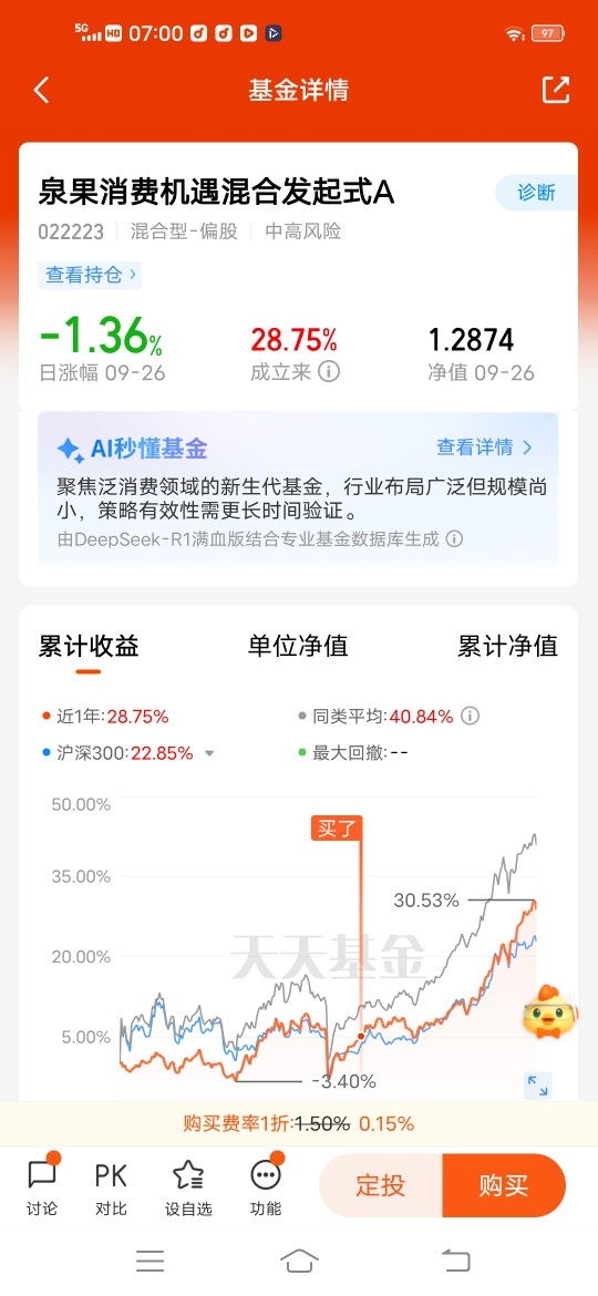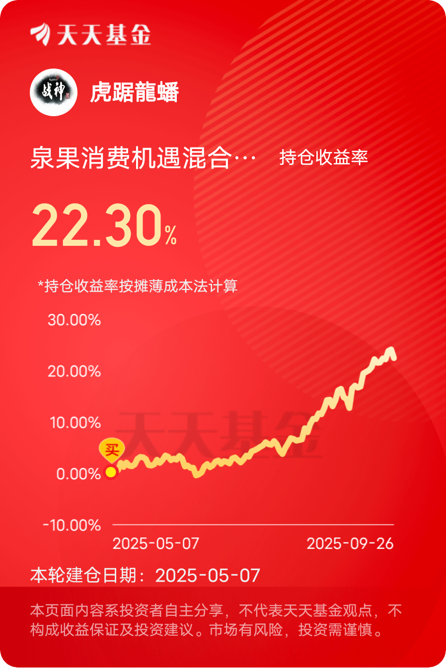 #牛市消费怎么买?# $泉果消费机遇混合发起式A$ 是一键布局消费赛道投资机遇的好选择!泉果基金孙伟经理管理的这只消费主题基金,聚焦泛消费领域投资机遇,基金净值近一个月上涨7.1%,大幅跑赢同类基金4.23%的平均涨幅,在4869只同类基金中排名居前,表现非常优秀,堪称消费类基金中的优等生!伙伴们可以关注一下。