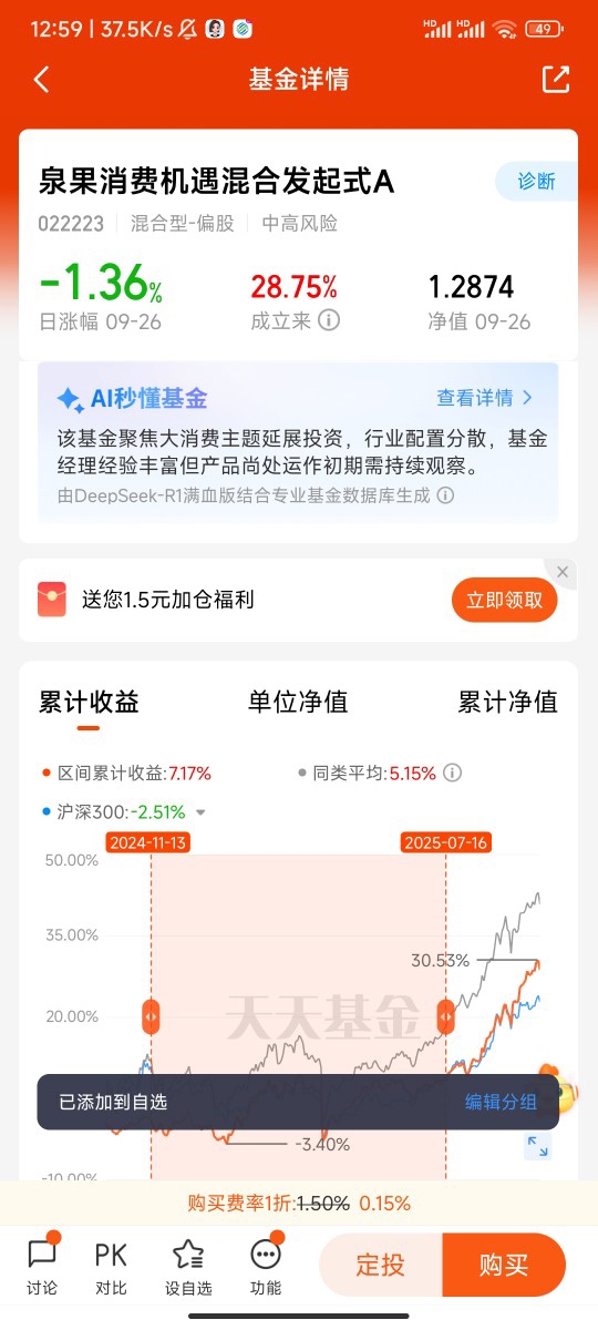 可能有人会问:“牛市里消费基金怎么买才不踩坑?”其实关键是“不追涨、看长期”。比如有的消费细分领域短期涨得太猛,要是追着买,很可能一进去就被套;而泉果消费机遇混合发起式A是主动管理,基金经理会根据市场情况调整持仓,比如某个领域涨多了就适当减仓,某个领域估值低了就加仓,不用咱们自己盯盘操作。另外,消费是个“长坡厚雪”的赛道,哪怕短期有波动,长期来看,大家对“好产品、好服务”的需求不会变,拿着这类消费基金时间长一点,更容易吃到行业增长的红利。