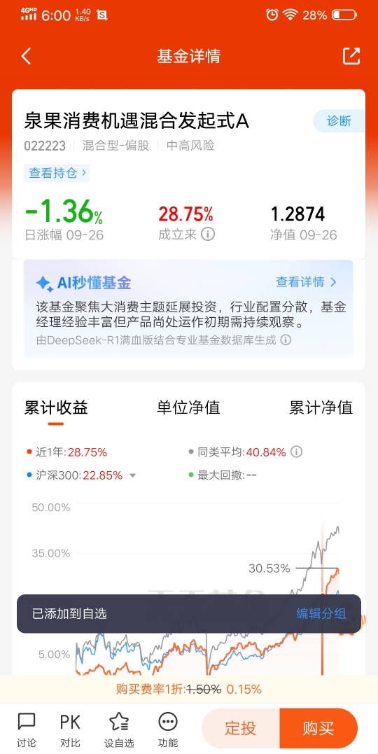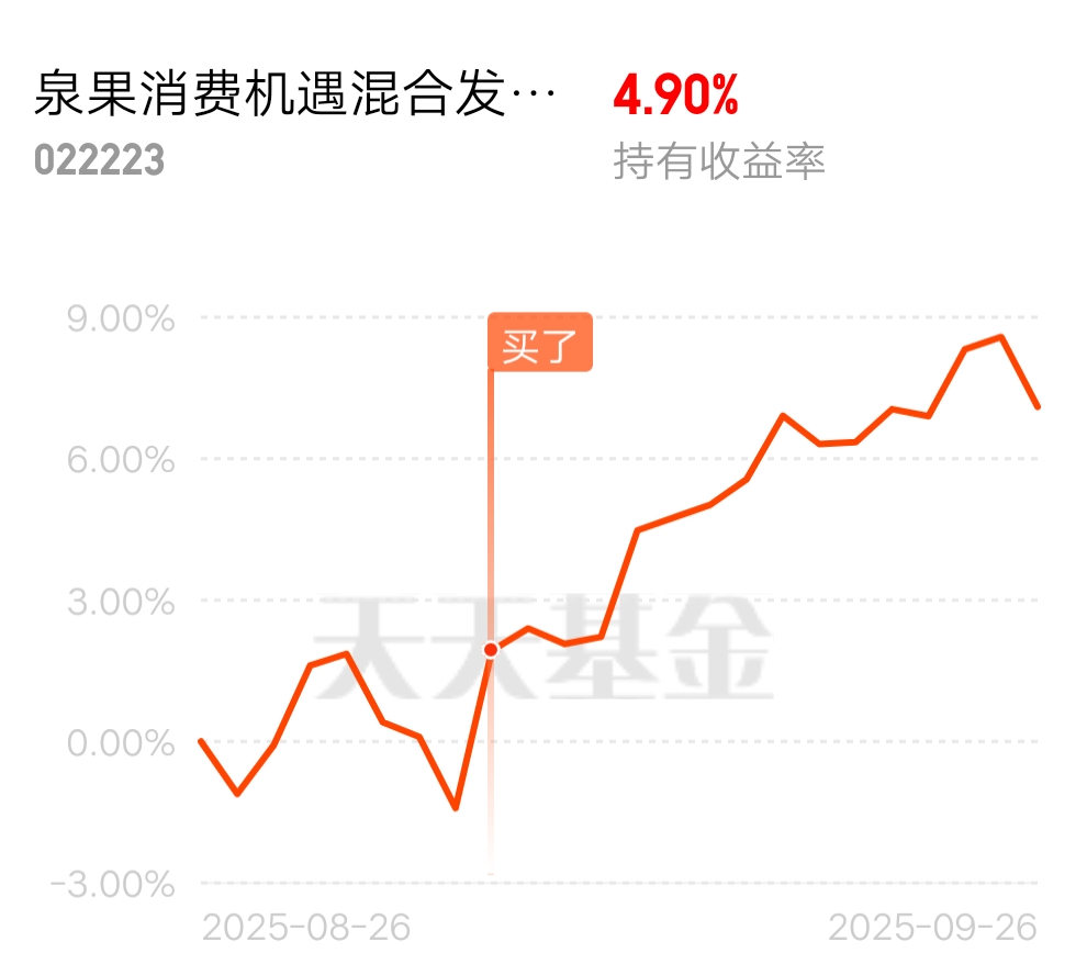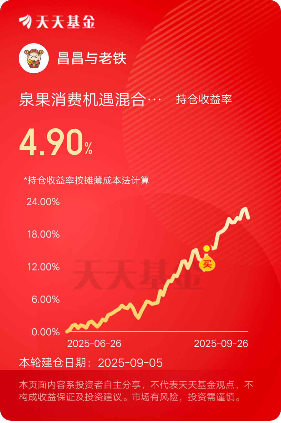 后续我会重点关注两个方向:一是新消费中具备技术创新或模式创新的企业,比如结合AI技术的智慧零售、主打健康概念的新消费品;二是旧消费中业绩复苏超预期的龙头,尤其是中秋、国庆等消费旺季带动下的食品饮料、家电板块。相信在政策托底、消费升级的大背景下,消费板块将持续释放潜力,而泉果消费机遇混合发起式A也能凭借精准的赛道布局,为投资者创造长期价值。$泉果消费机遇混合发起式A$
