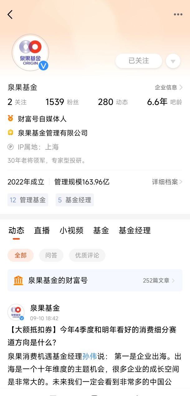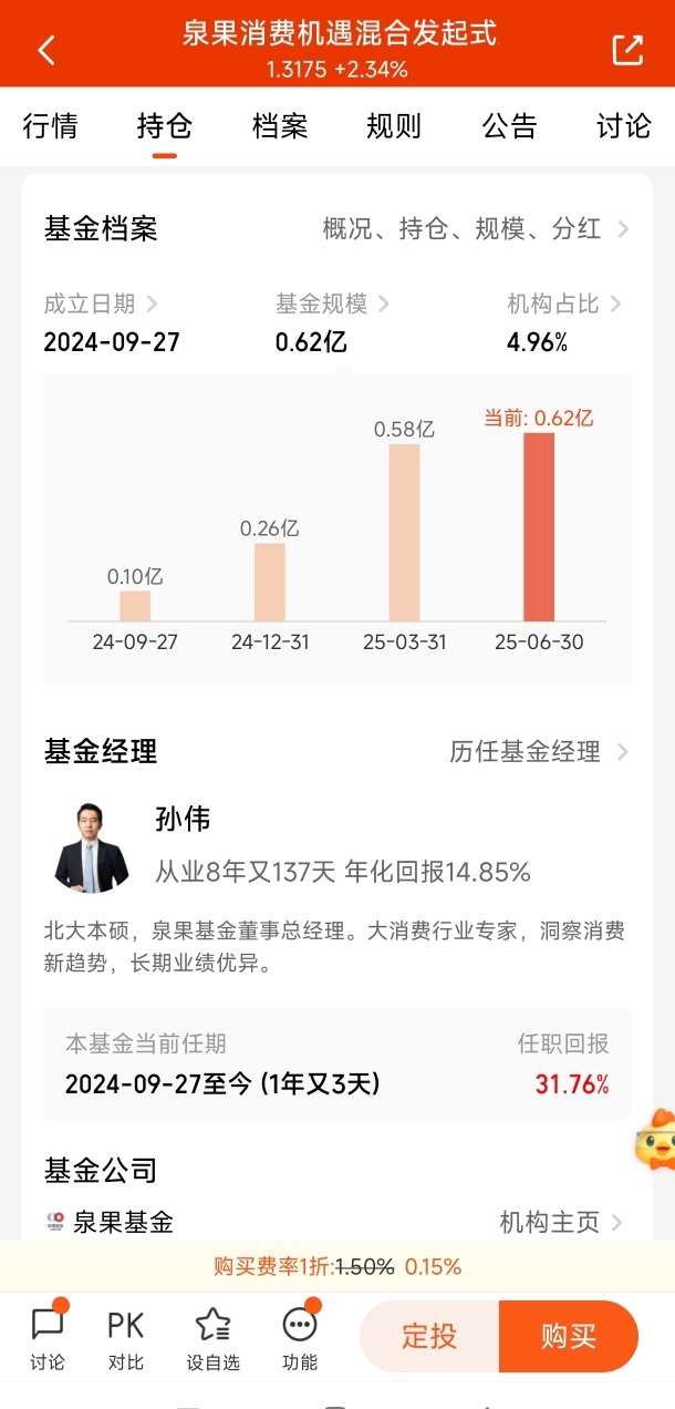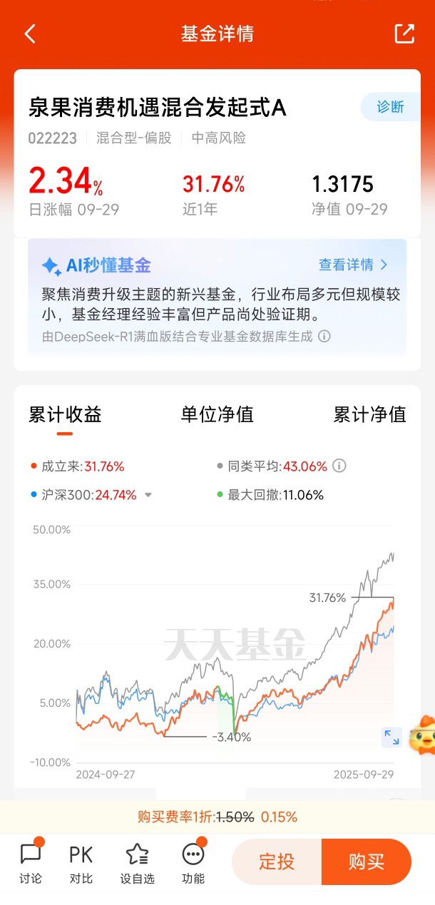 对多数投资者而言,直接捕捉消费细分机会难度极高(如AI消费、出海链等需专业研判)。而泉果消费机遇混合发起式A(022223) 恰是聚焦这一领域的专业化工具。该基金成立于2024年9月27日,基金经理孙伟与公司自有资金出资1000万元并承诺锁定3年,与投资者利益深度绑定。其投资范围覆盖互联网、新消费、消费出海、消费电子四大方向,既能捕捉传统龙头估值修复,又能掘金新兴赛道。对于希望参与消费升级、却缺乏研究资源的普通人,该基金提供了“分散风险+精准布局”的双重价值。