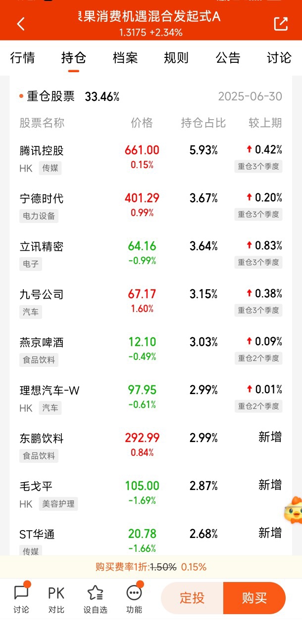 基金经理孙伟是基金灵魂人物。他拥有15年证券从业经验,管理公募基金超8年,年均回报12.58%。其代表作东方红睿满沪港深混合在2017-2023年任职期间累计回报134.69%,超额收益达114个百分点。投资风格上,他坚持“中庸之道”:既保留对传统消费龙头的价值挖掘(如持仓美的集团、恒瑞医药),又积极拥抱科技消费(如重仓九号公司、理想汽车-W)。更重要的是其言行一致——在2024年四季报中明确看好互联网与消费出海,2025年一季报即加仓腾讯控股、名创优品等标的。这种“策略透明+操作落地”的稳定性,极大降低了风格漂移风险。