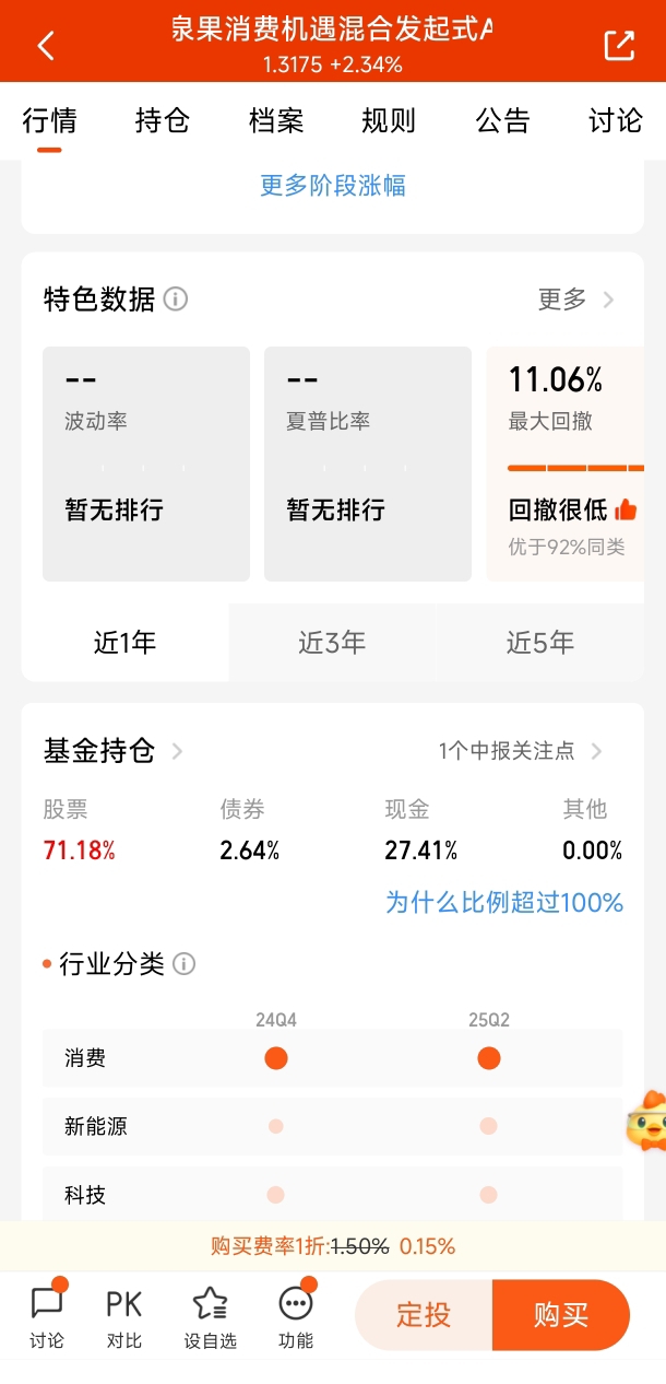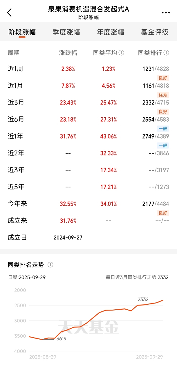 基金的长期业绩是检验管理能力的核心标准。泉果消费机遇混合A自2024年9月成立至2025年9月,累计回报达28.74%,年化收益率31.36%,在同类基金中排名前10%。分周期看:今年以来回报32.55%,近一月收益7.87%(超越76%同类产品),近一周涨跌幅2.38%(超越75%同类)。更关键的是其适应性——在2025年一季度市场震荡期,基金仍实现6.82%的正收益,而近半年回报稳定在7.20%-7.28%,持续跑赢基准(超额收益约2-3个百分点)。这种“牛市中跟上指数,震荡市中创造超额收益”的特质,体现其策略的有效性。此外,基金成立以来年化夏普比率达2.05(超过75%的同类产品),意味着每承担一单位风险可获取更高回报。数据印证了其“收益与风控兼顾”的长跑能力。
