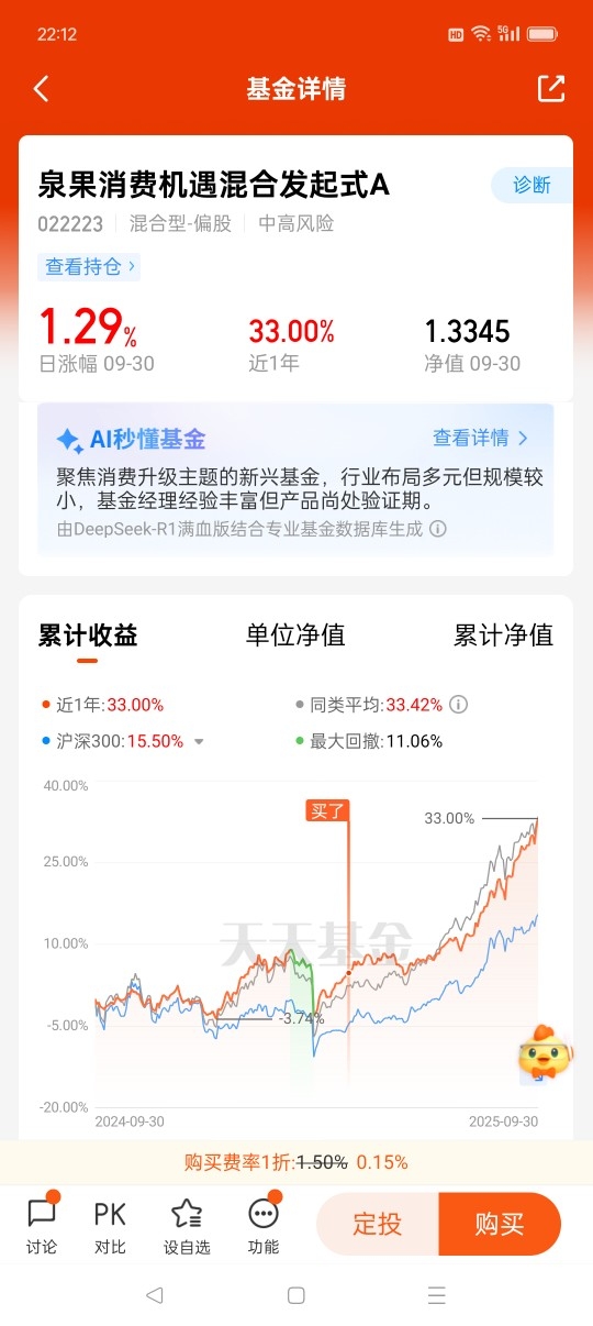 #牛市消费怎么买?# $泉果消费机遇混合发起式A$ 是一键布局消费升级投资机遇的优选!泉果基金孙伟经理从业8年以上,是大消费行业专家,能够洞察行业趋势,把握价值投资机会,他管理的这只消费主题基金,近一年收益率33%,近一个月收益率9.26%(同类基金平均值5.49%),超额收益显著,在4826只同类基金中排名前列,表现非常优秀!