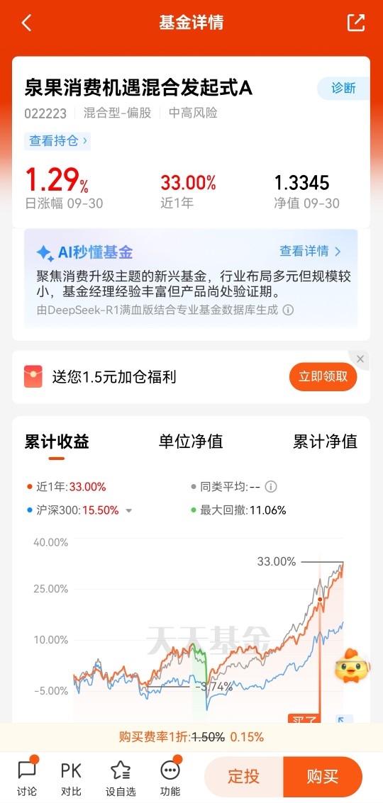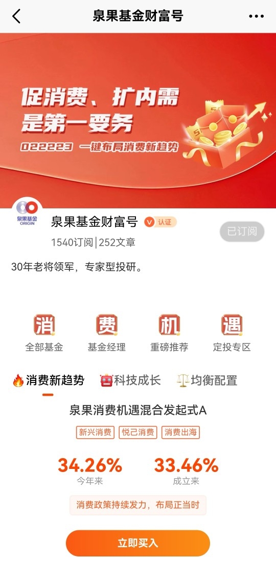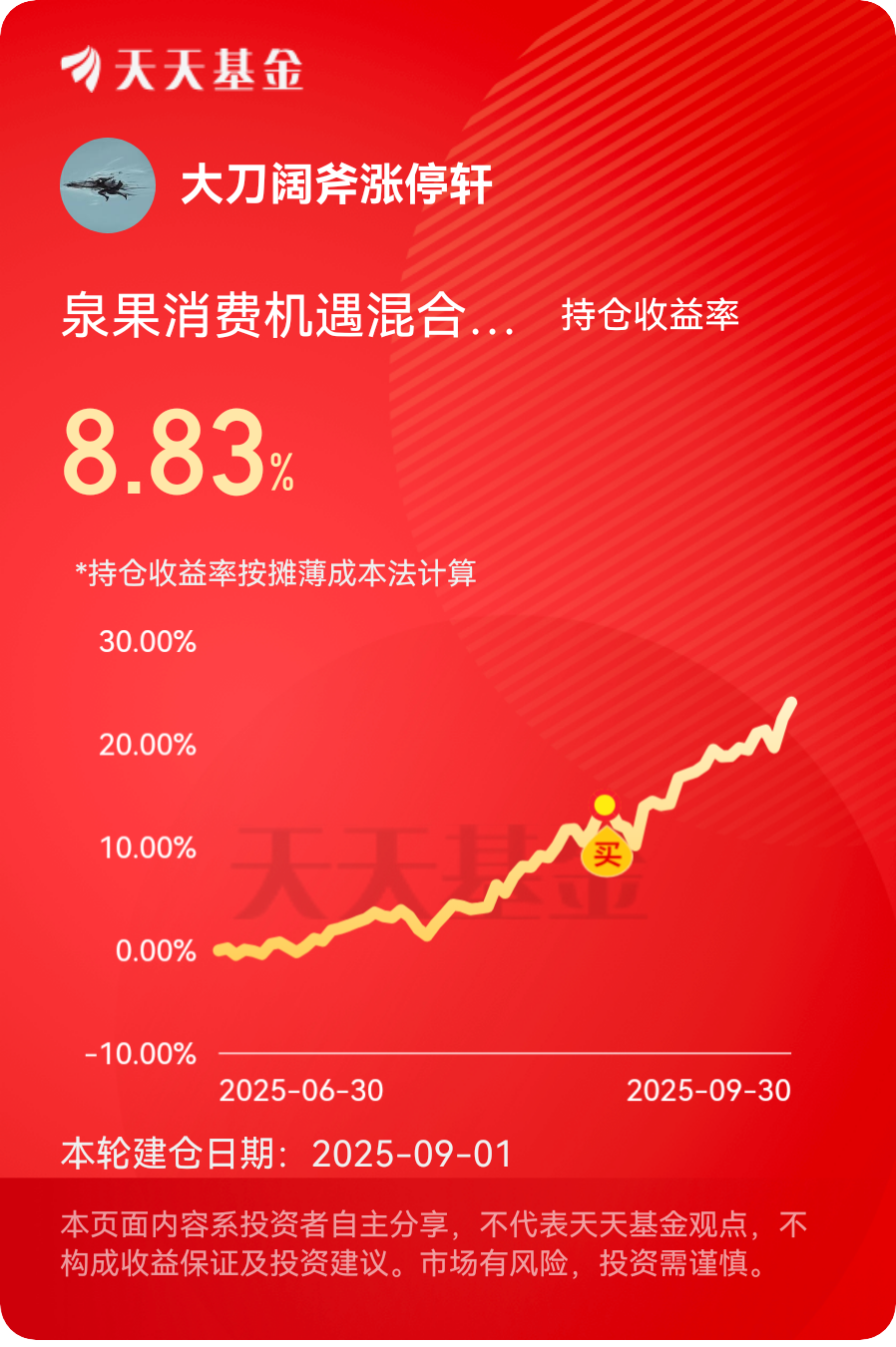 再者,今年的中央经济会议将“全方位扩大国内需求、大力提振消费”作为九大重点任务之首,以旧换新力度空前,近期密集出台相关消费政策,国补剩余额度集中投放,财政贴息“个人消费贷款+服务业经营主体贷款”借贷成本,商务部等9部门印发《关于扩大服务消费的若干政策措施》,8部门同步印发《大力发展数字消费指导意见》,还有地方文旅、餐饮补贴等,更深层次的推动新旧消费的增长,$泉果消费机遇混合发起式A$#晒收益# 契合当前市场消费格局走向,近一月以来在科技狂飙的风口之下,也同样有一定的增速,在后续新消费格局稳固发展,旧消费由消费旺季的情绪带动下,会展现出更强的上升动力,在政策支持+市场经济回暖的过程中,将会不断推动消费复苏,为居民消费提供强有力的增量资金与场景支持,为情绪消费也好,也情怀消费也罢,消费时点正在当下资金高低切换中彰显投资魅力,个人认为四季度的消费机遇值得把握,期待泉果消费继续乘风破浪!@泉果基金