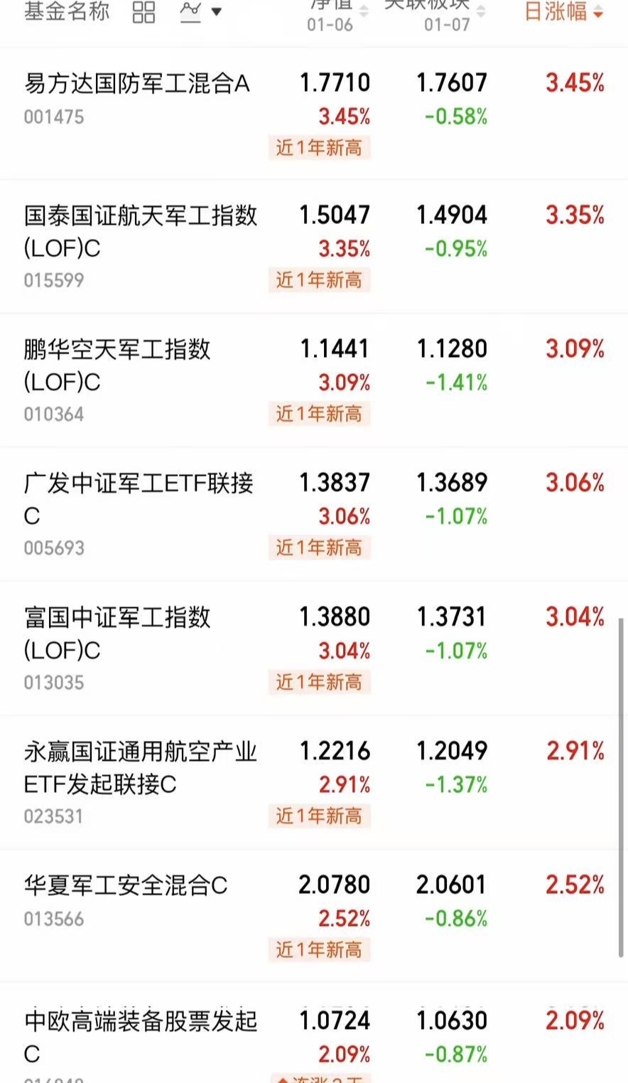 $易方达国防军工混合A$ 这只主动的军工混合基金。持仓覆盖面也是比较广。覆盖了了军工以及商业航天等。昨天上涨了3.45%。同类军工基金长期业绩做到了优秀。我看好今年的稳定收益表现。期待继续创新高。