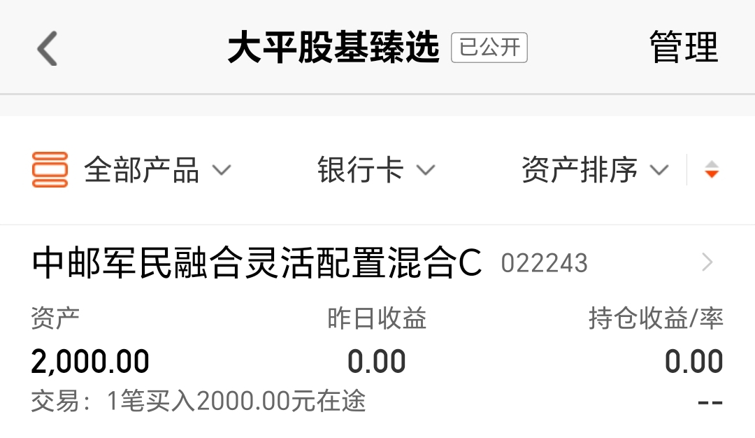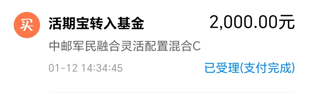 今天我买入$中邮军民融合灵活配置混合C(OTCFUND|022243)$2000块钱。