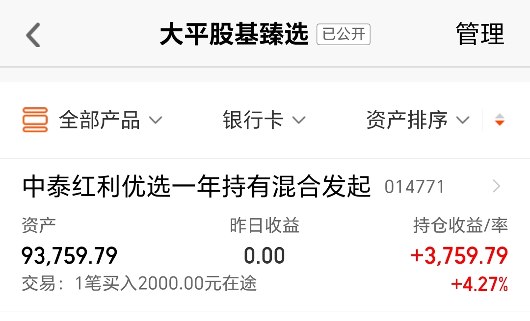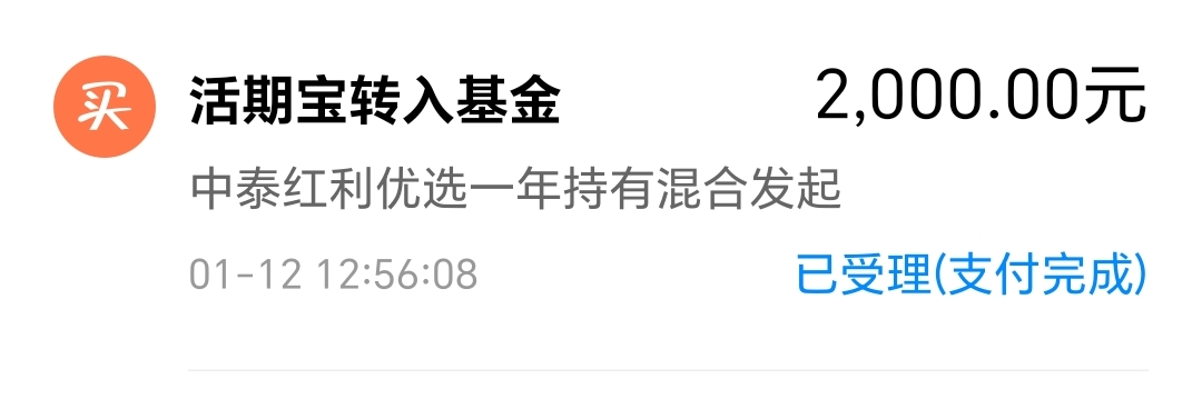 今天我买入$中泰红利优选一年持有混合发起(OTCFUND|014771)$2000块钱。
