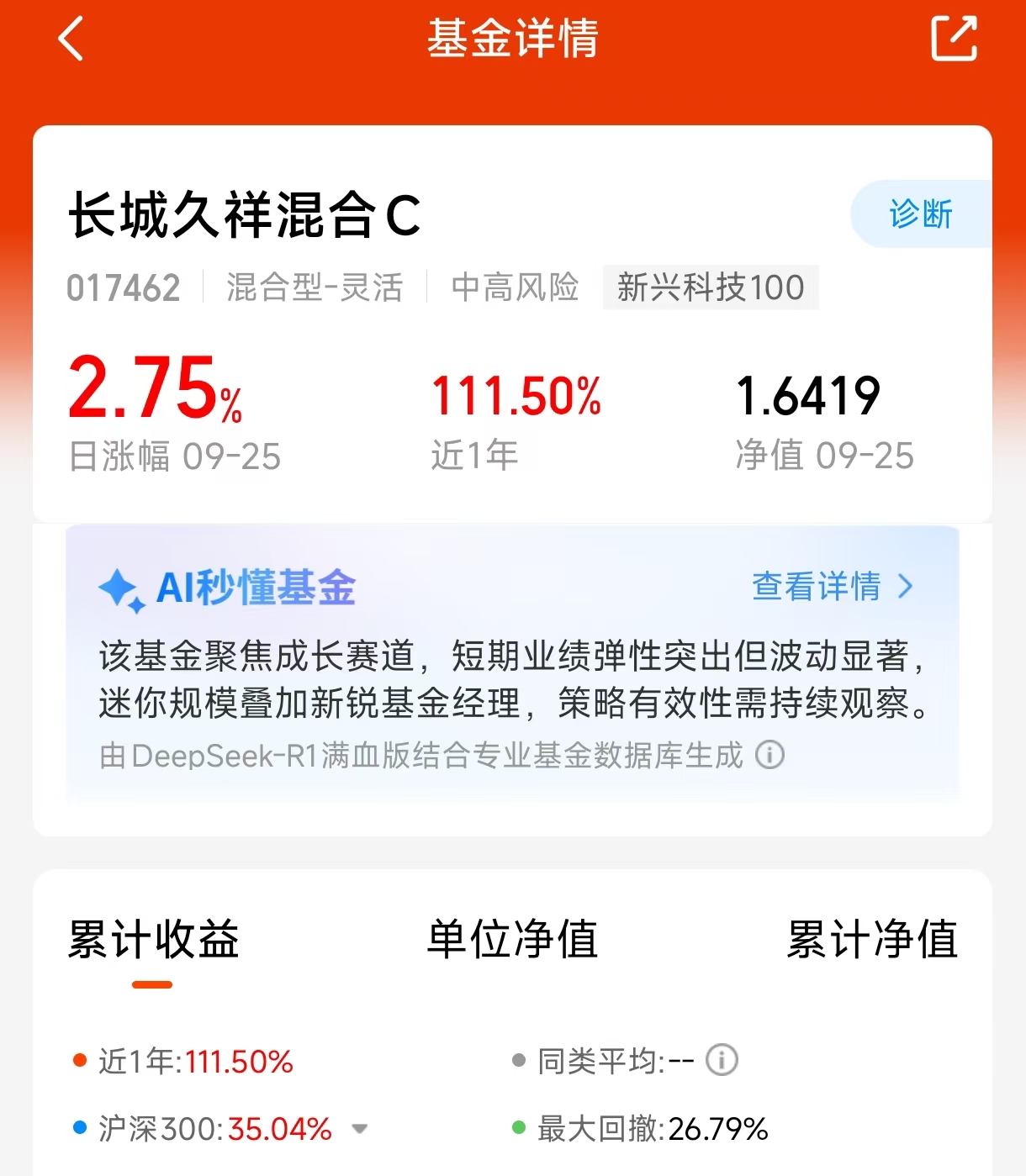 算力行情真的来了,$长城久祥混合C$(017462)今天又涨了2.75个点,远远把像大摩数字经济混合C(017102)这些同类产品甩在后面。这基金重点投AI算力,加上一些基本面扎实的游戏公司。看它现在调仓,算力比重又提高了,尤其关注那些在国内外算力链上有潜力的公司。近一月收益超17%,近一年超111%,这数据摆在眼前,确实值得重点关注。现在市场热点明确,要上车算力,这个基金算是很直接的选择。#创业板指创阶段新高 致敬“924行情”#