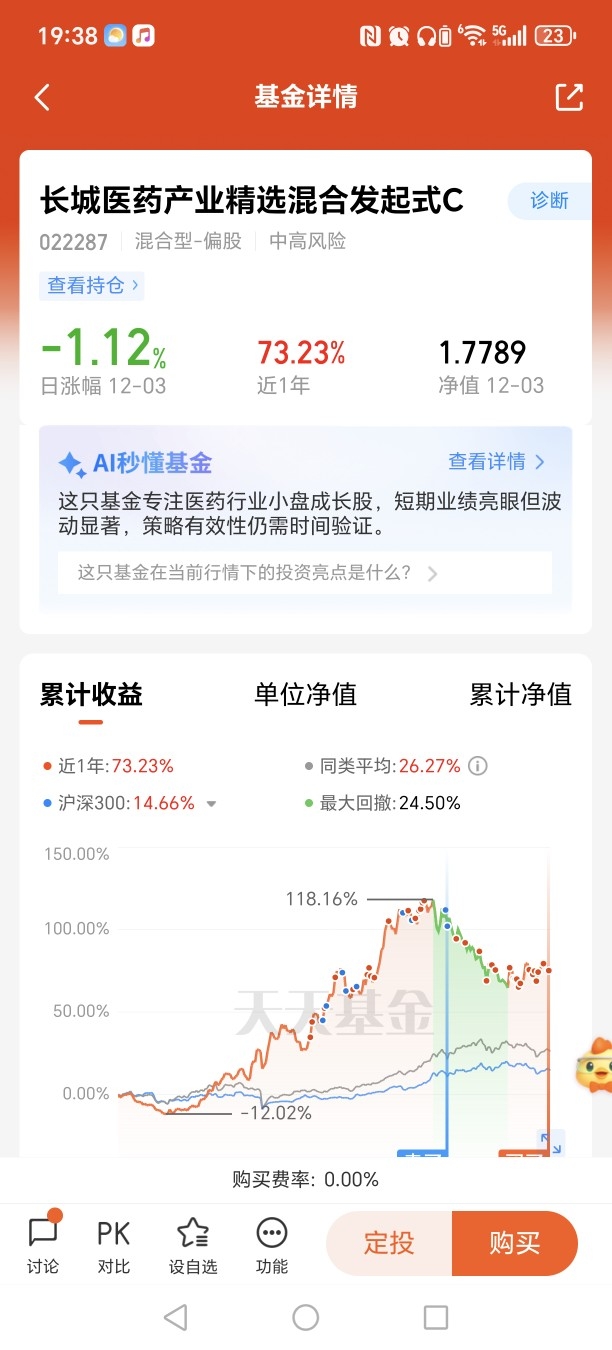 $长城医药产业精选混合发起式C$看看我这段时间的加仓频率。几乎看不到曲线了。说了