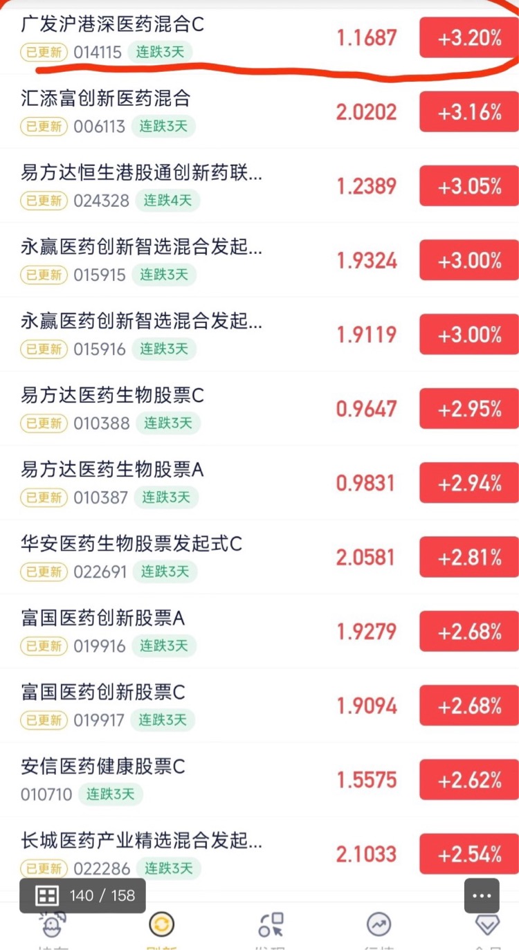 朋友刚割肉医药就回暖,还好我拿住了$广发沪港深医药混合C$,3.20%涨幅同类最高,今年的医药我觉得会持续爆发,可以和$安信医药创新股票型发起C$