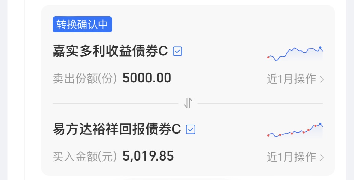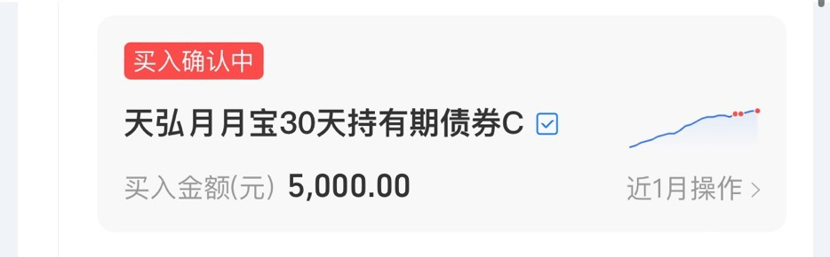 $天弘月月宝30天持有期债券C$ +5K,这是一只纯债基金,没有参与投资股票和可转债,信用债为主+少量利率债波段增强,查看历史净值这一个多月回撤仅0.01%,回撤控制上还是蛮好的,业绩上看今年以来收蛋209个,远超同类均值的1.31%,最近大盘上4000点后来回震荡,债市这边自从央妈恢复买债后企稳一段时间了,不过中长债个人暂时就不去追了,今天继续定投一笔天弘月月宝30天持有期债券C,拿来当底仓防守还是不错的,长期下来收益也跑赢了货币基金和大额存单。