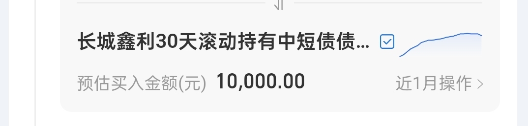 $长城鑫利30天滚动持有中短债C$ +10000,今天新建仓老牌固收,属于低波型纯债,长城还是蛮喜欢的,在固收里面也是比较出色的,最近行情比较震荡,想着稳点来,配置些低波型纯债放着了,翻看历史净值,中间连续涨了2个月,到现在中途也才丢过2次蛋,撤回控制的很不错,这种类型的基当做底仓非常安心,收益又不错,波动又平稳,近一年收益3.38%,对于稳健理财来说收益真棒,现在股市行情震荡,加上银行存款利率越来越低,存银行一年才0.95%,闲钱还是要打理起来,钱生钱存起来了真的很快,收益相比余额宝和定期,直接多出几倍,波动还小。当做存钱罐抱着就行啦,而且30天滚动持有,能够很好的管住手,拿稳就行了,长期看收益非常棒,今天新建个底仓10000放着了!