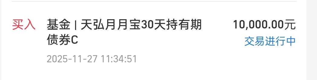 $天弘月月宝30天持有期债券C$ +10000,最近行情比较震荡,那我稳着点来,配置些低波型中短债,当做底仓放着,稳稳锁住收益。天弘作为老牌固收,也持有过挺多,收益一直都很不错,就算今年行情比震荡,月月宝今年来依旧收益2.12%,对于稳健理财来说,收益非常满意了,现在银行一年期存款利率也就0.95%,收益高出很多,重点波动也非常平稳,最大回撤才0.1%,真是不错呢!天弘主要持仓以113.61%信用债为主,搭配了6.12%利率债增强整体收益,不含股票和可转债,超级稳的一只,我当做当做存钱罐抱着啦,今天大额建仓10000放着了!