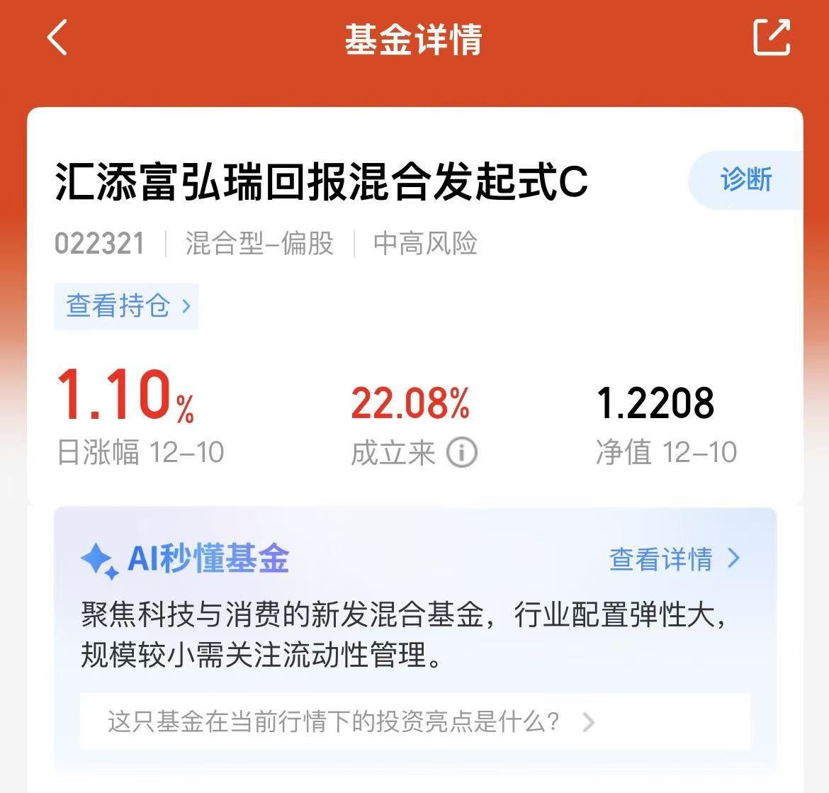 我今日分批布局$汇添富弘瑞回报混合发起式C(OTCFUND|022321)$,这只“高纯有色基”聚焦上游资源型企业,规避冶炼环节,发挥主动选股优势。持仓全面,铜资产占比超70%,还覆盖铝、碳酸锂等小金属,且可A股港股双线掘金,比单一市场同类更具优势。自11月更换基金经理后,业绩表现爆发,近三个月涨幅近10%,近六个月涨超25%,大幅领跑同类平均,超额收益显著。当前美联储降息通道已开启,叠加新能源、算力基建对铜的需求激增,铜价仍具上涨空间,行业红利持续释放,后续成长潜力值得期待。