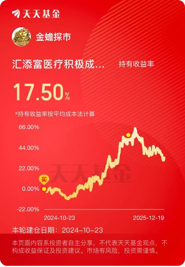 我这哑铃的 “进攻端”,主要放两类资产:美股科技和手里持有的$汇添富医疗积极成长一年持有混合A(OTCFUND|009664)$。选美股科技没什么复杂理由,全球顶尖的科技公司大多在那儿,AI 浪潮这么火,不管是算力芯片还是 AI 应用,它们都是最直接的受益者。而且 2026 年美联储大概率还会降息,资金肯定更愿意往这些高成长的标的跑,长期拿着不吃亏。至于汇添富这只医疗基金,当初买是看中了医疗行业的刚需属性,最近看到报告说 2026 年医疗行业会加速复苏,AI 还能帮着提高药物研发成功率,觉得没选错。它重仓的都是生物科技、创新药这类高潜力公司,虽然波动不算小,但作为进攻端的一部分,刚好能弥补美股科技之外的成长机会。