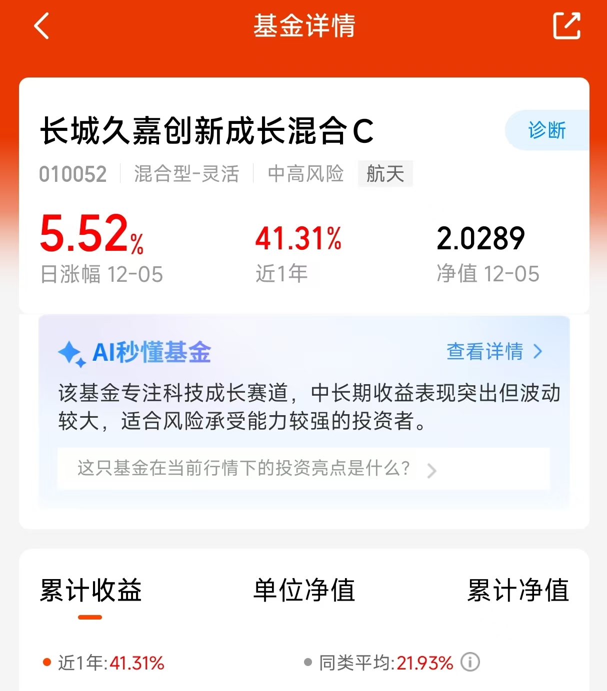 最近市场轮动快得跟电风扇似的,追热点追得心累吧?但有个方向我越看越觉得稳,就是商业航天!国家都专门设了商业航天司来搞这事,未来几年路线图都画好了,这可不是炒概念,是实打实要落地的大产业。我今天一看持仓,发现手上一只基$长城久嘉创新成长混合C$(010052)居然悄悄冲到了涨幅榜第一,单日干到了5.52%,可比德邦半导体产业混合发起式C的-0.16%猛太多了。它为啥这么强?我研究了一下,它重点押注的就是商业航天和卫星互联网这条黄金赛道,正好踩在了国家发力的点上。更让我惊喜的是业绩,这基近1月涨了12.48%远超同期的永赢高端制造混合C的0.43%,这超额收益在眼下这行情里可真是不多见。我自己是已经加仓了,感觉这种有政策背书、有真实产业进度的方向,拿着心里踏实。建议你们也赶紧加个自选关注起来,市场要是给回调的机会,可以考虑分批上点车,别等所有人都反应过来的时候再去追高。#牛市旗手猛飙:短期反弹or趋势反转?#