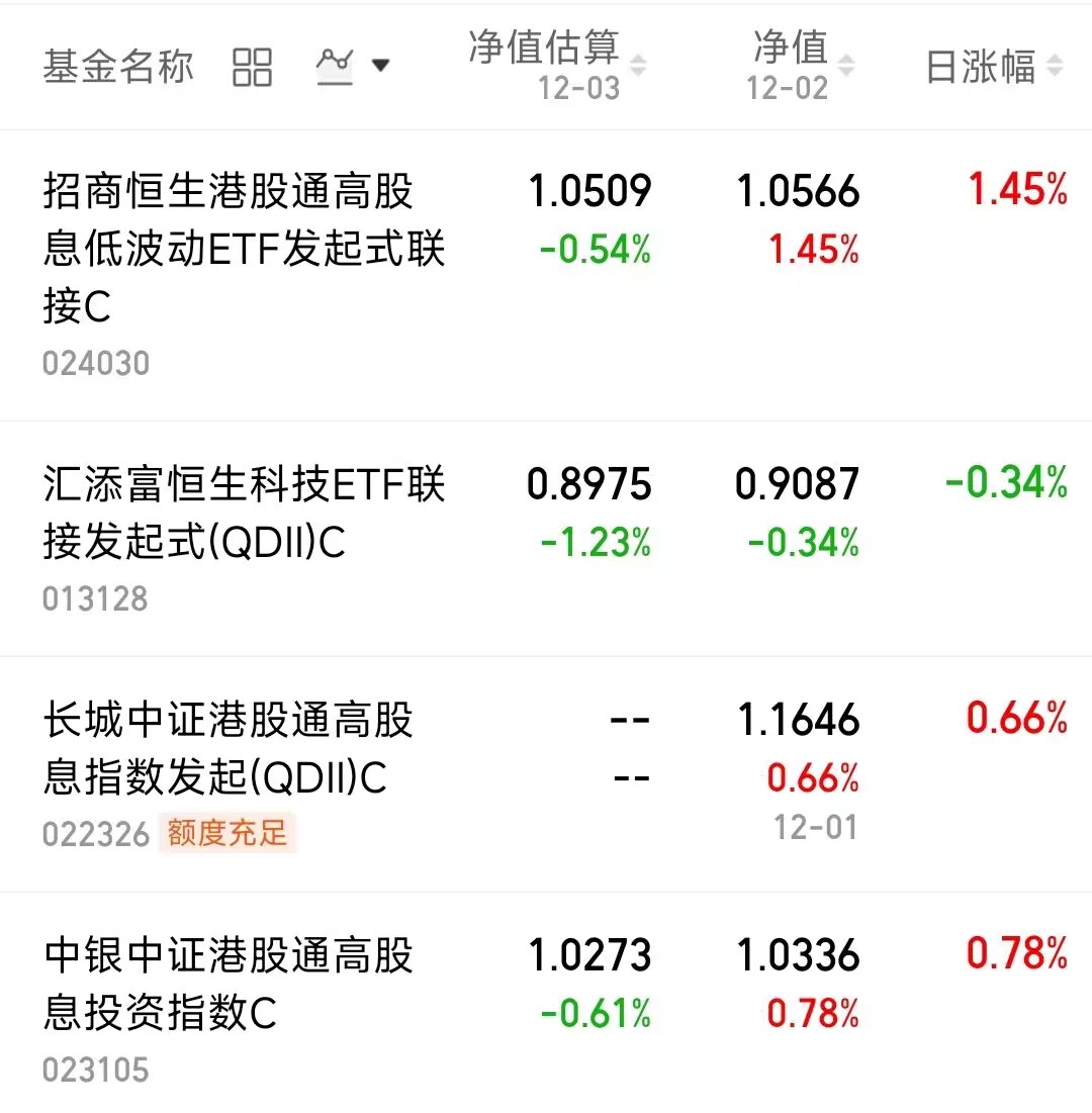 高股息低波基金的核心优势就是稳!高股息意味着公司赚钱能力靠谱,愿意给股东分真金白银;低波动则是股价不容易大跳水,两者叠加,在震荡市里简直是双 buff 加持。$招商恒生港股通高股息低波动ETF发起式联接C(OTCFUND|024030)$昨日上涨1.45%,$汇添富恒生科技ETF联接发起式(QDII)C(OTCFUND|013128)$昨日下跌0.34%,$中银中证港股通高股息投资指数C(OTCFUND|023105)$昨日上涨0.78%。