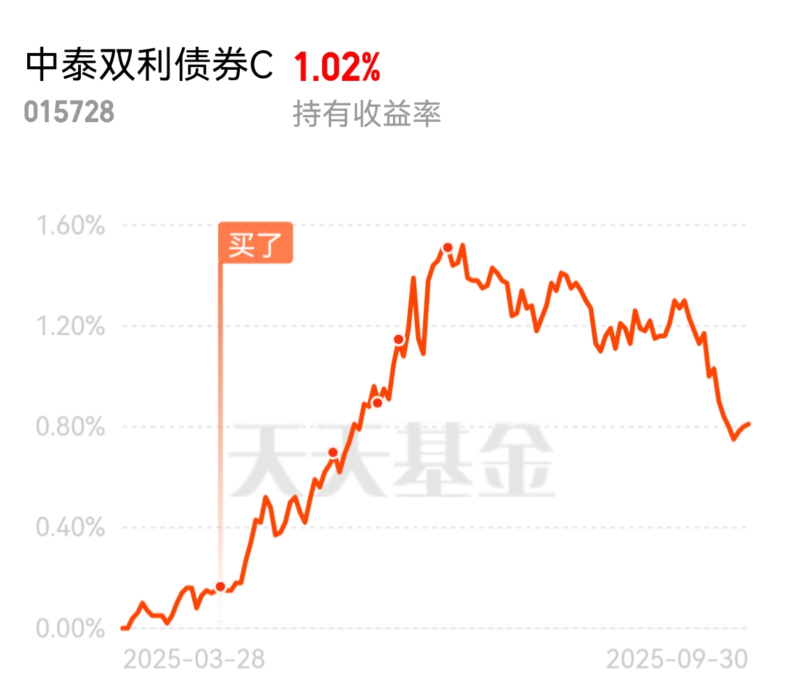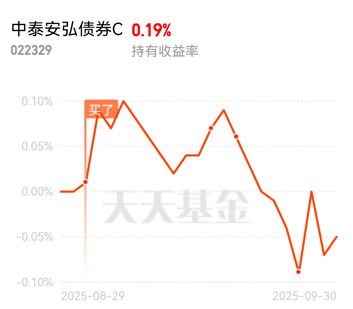 今天是普涨行情,稳健纯债中泰安弘债券C产蛋2个,没有什么惊喜,不过今年来涨幅2.28%,还是领跑全市场的。低波固收+中泰双利债券C产蛋1个,银行股跌得比较狠!