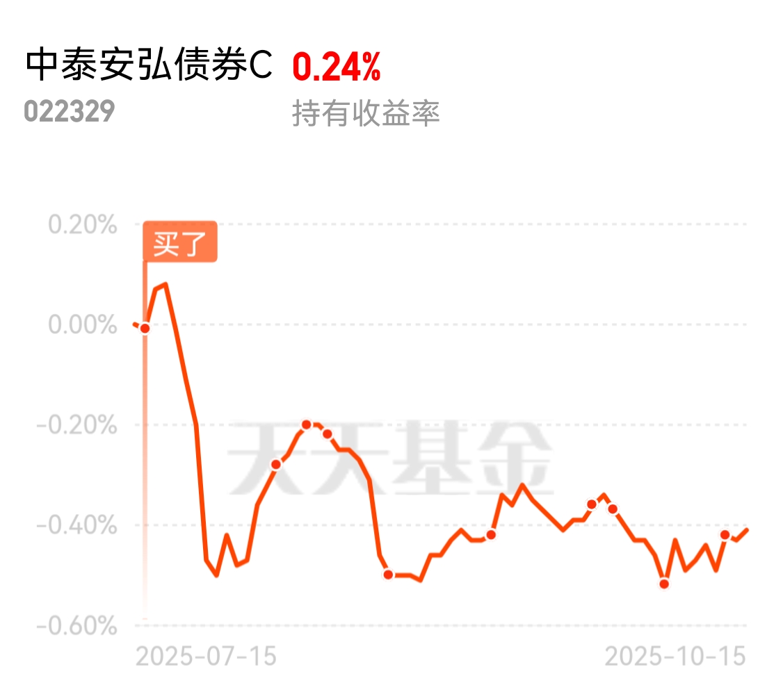 今天债市偏弱,稳健纯债中泰安弘债券C能产蛋2个,还是可以的。今年来涨幅2.35%,今年极少数能逆势跑出超额收益的纯债基金。