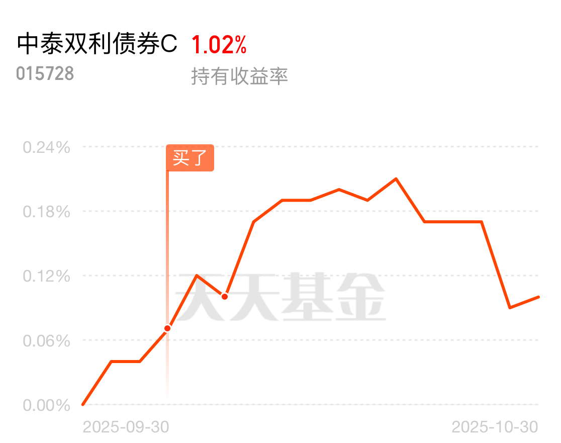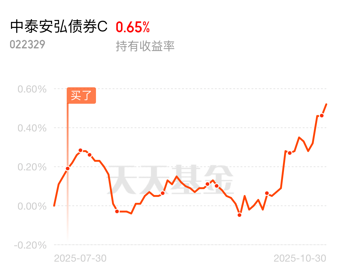 今天稳健纯债中泰安弘债券C产蛋7个,还是可以滴,今年来涨幅2.82%,同类排行优秀水平。低波固收+中泰双利债券C也产蛋1个,虽然三季度末持仓显示纯债,不过从季度报告来看,可能还是有一些银行股等价值型、红利型持仓,这几天的净值表现也不像是纯债。