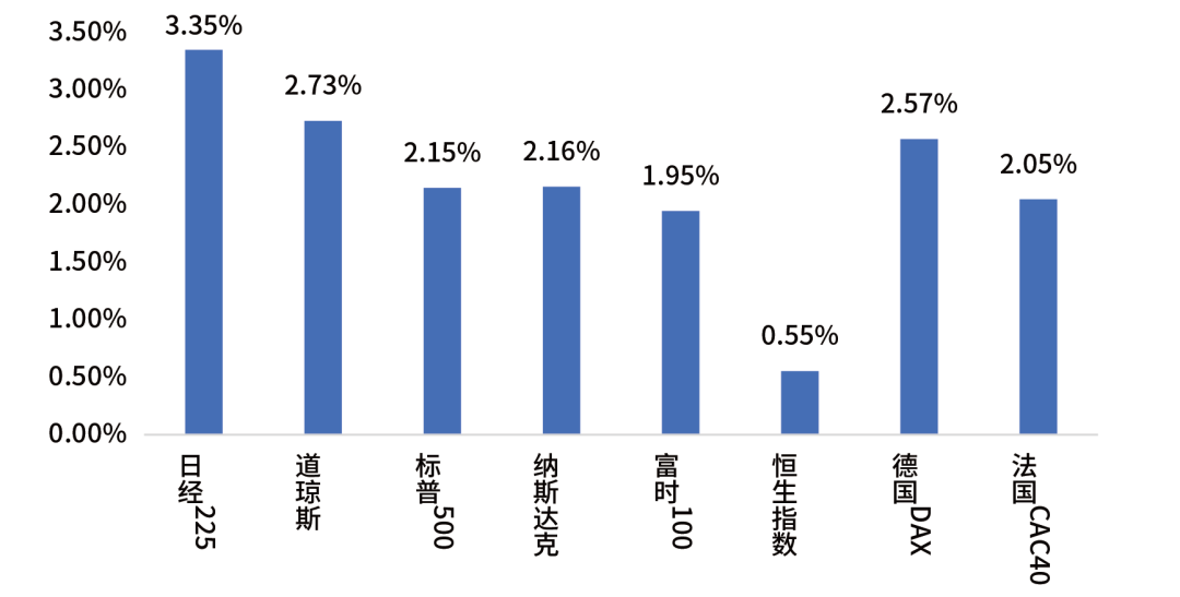 上周海外股市集体上涨。美国股市方面,道指上涨2.73%,标普500上涨2.15%,纳指上涨2.16%;欧洲股市方面,英国富时100上涨1.95%,德国上涨2.57%,法国上涨2.05%;亚太股市方面,日经指数上涨3.35%,恒生指数上涨0.55%。