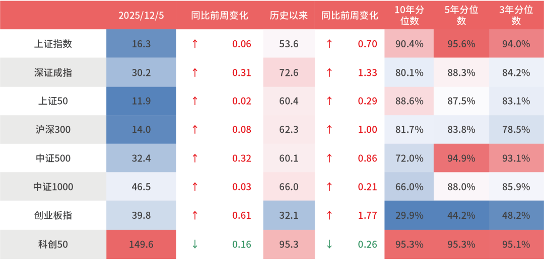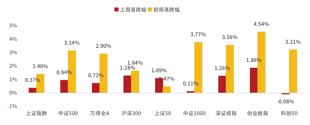 上周A股宽基指数多数上涨。截至12月5日,创业板指上涨1.86%、沪深300上涨1.28%、深证成指上涨1.26%,涨幅居前。从行业板块看,上周有色金属、通信、国防军工领涨,传媒、房地产、美容护理领跌。