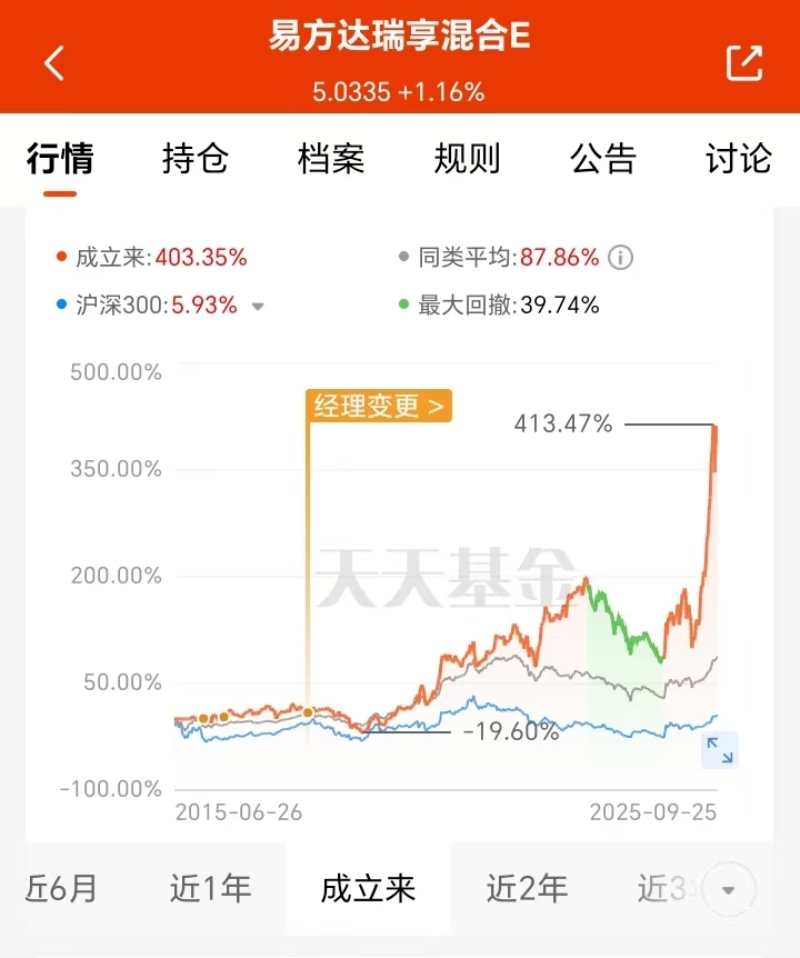 今日A股低开后持续震荡下行,板块轮动加速,科技板块整体回调,能源、金属与金融板块则逆势反弹。即便是牛市行情,短期高波动也会有的,所以布局长期业绩稳健的产品更显稳妥点。像$易方达瑞享混合E(OTCFUND|001438)$这类成立以来涨幅超 400% 的产品,不仅精准捕捉成长机遇、长期走势强劲,成长行情中爆发力亦优于同类,我也准备长期持有,期待后面更大的收获呢。#“924行情”一周年 你赚了多少?#