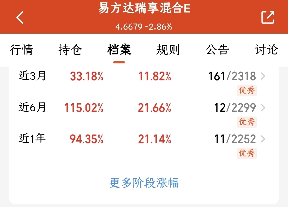 今日A股高开高走,三大指数全线收红,科技板块领涨。$易方达瑞享混合E$ 基金凭借精准布局CPO概念股,展现出强劲的业绩表现,近三个月涨幅达33.18%,近六个月更是实现115.02%的亮眼回报。基金经理展现出优秀的调仓能力,过往操作果断且成效显著。在当前市场波动加剧、板块轮动频繁的背景下,该基金采取全市场配置策略,能够有效分散风险。基于对基金经理能力的认可及对后市行情的看好,我决定采取分批加仓策略,以把握市场机遇。