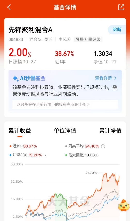 先锋聚利混合A近三个月10.97%慢慢涨,不玩虚的,近六个月27.15%才是真实力,成立以来都翻倍了拿得住才是赢家。