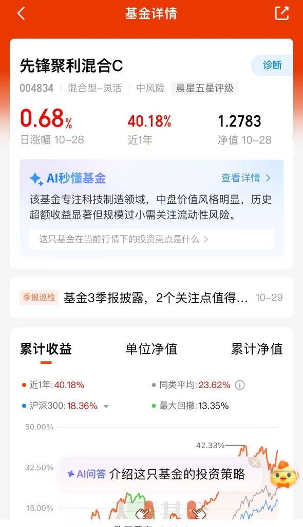 自主可控主线被先锋聚利混合C玩明白了,近一年40.18%收益,稍稍回调,今天不更好上车?