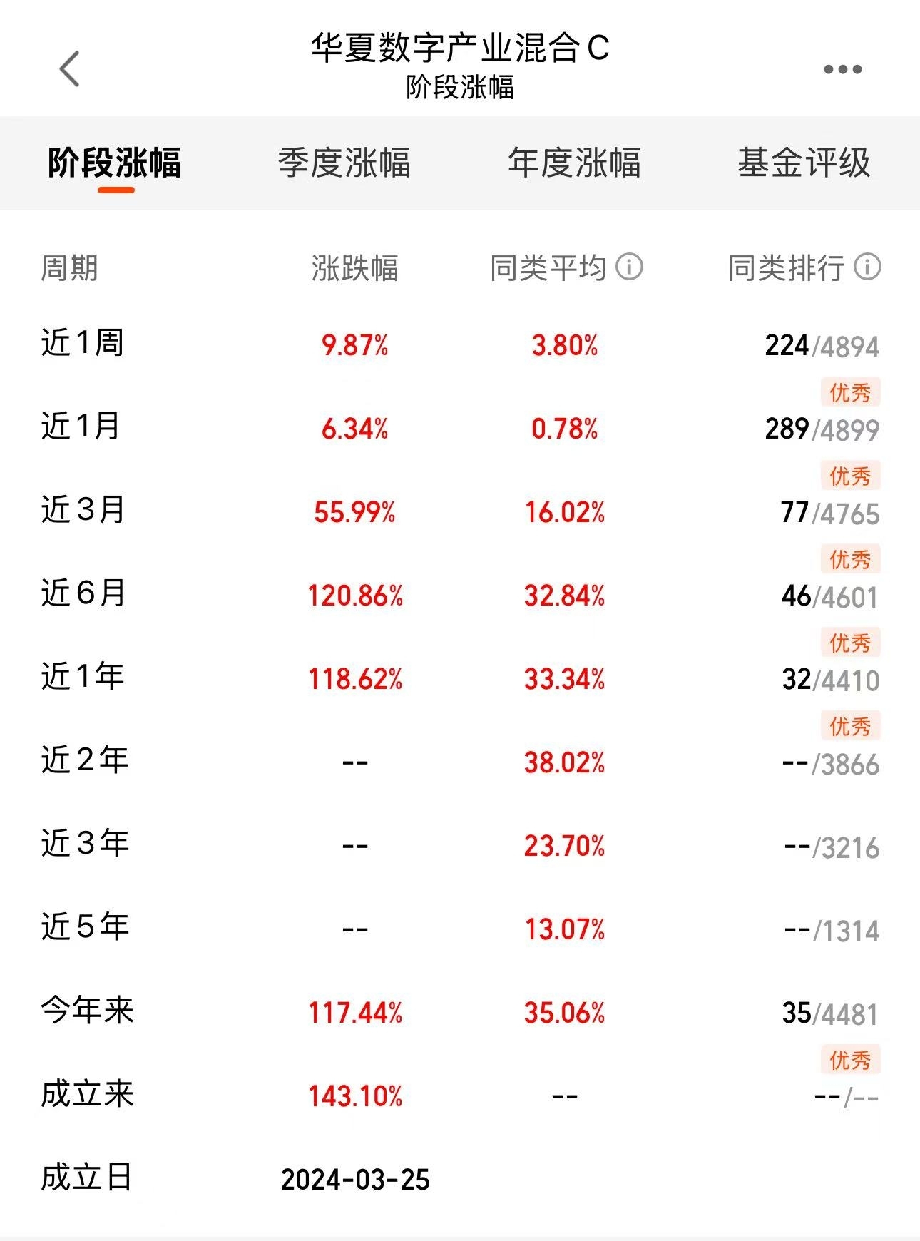 全球的流动性宽裕,科技的算力和AI仍有较大的机会,连红4天,近3个月收益近56%,各阶段的业绩都这么优秀,$华夏数字产业混合C$无论是收益能力还是行业前景都值得期待,今天要是回调我就加仓了