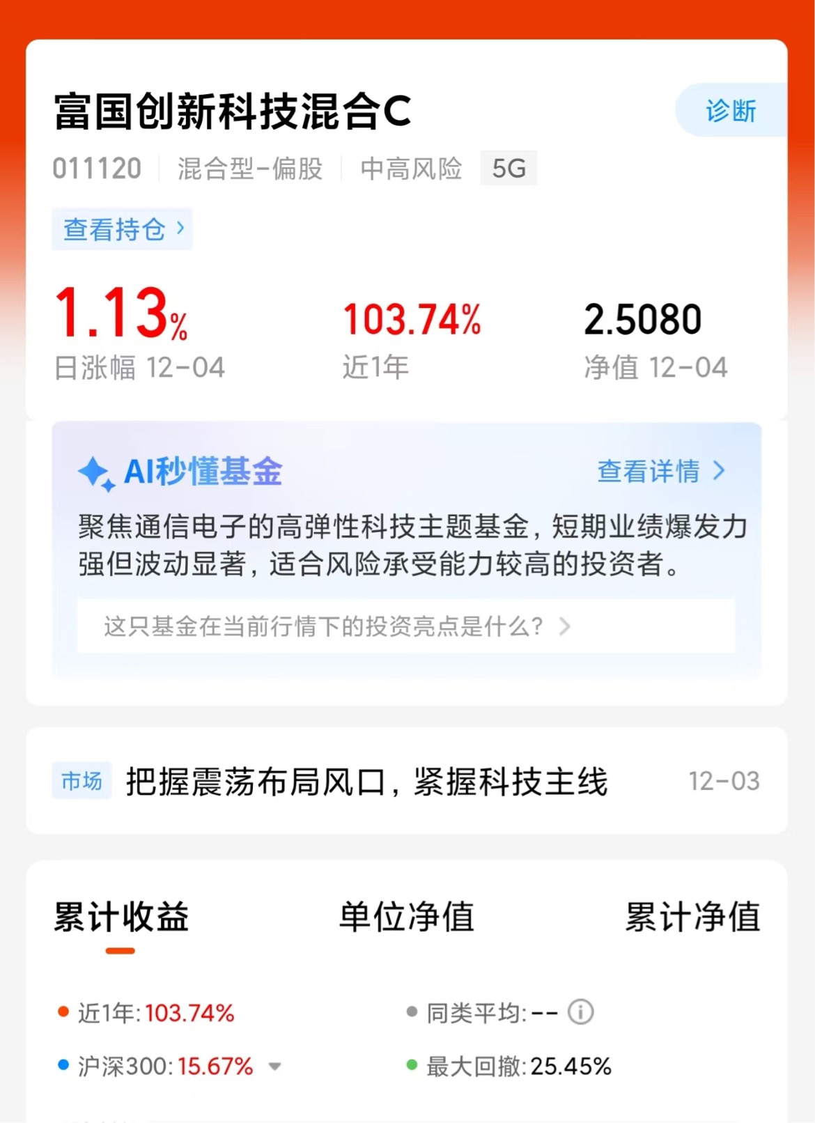$富国创新科技混合C$ 今晚涨了1.13%,快年底还是配置点科技板块稳妥点,而且这个基一年涨幅超100点了