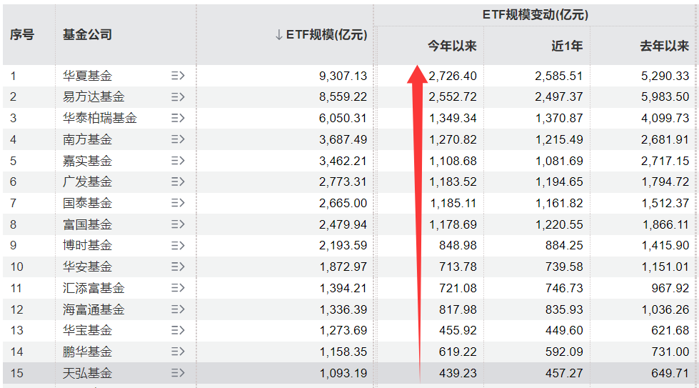 以狂飙突进的ETF基金为例。目前,共有15家基金公司的非货ETF规模超过1000亿元,华夏基金、易方达基金非货规模均超8000亿元,年内新增均超2500亿元,成为最大赢家;华泰柏瑞、南方、嘉实、广发、国泰和富国基金等6家公司年内新增规模均超过1000亿元,位列第二梯队;博时基金、海富通、汇添富和华安等公司年内新增规模也均超过700亿元,位列第三梯队。