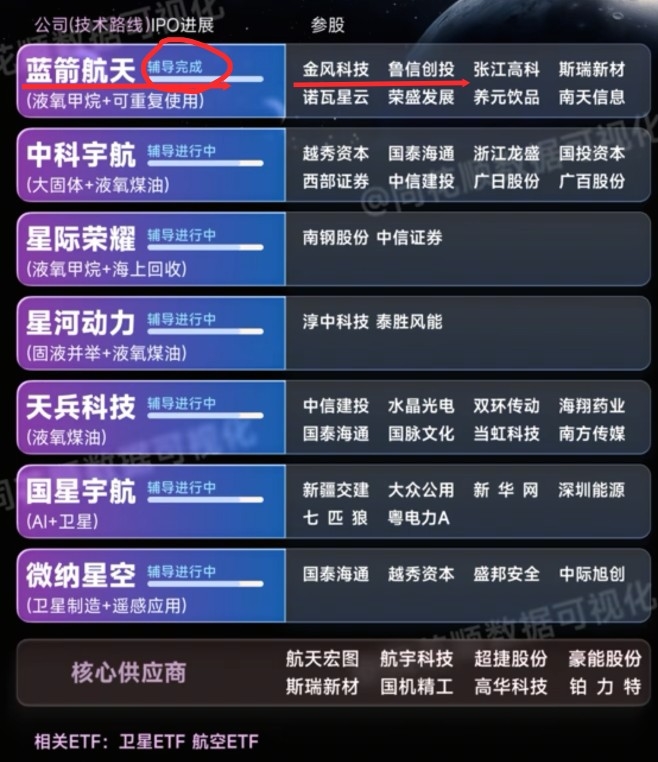 板块没有结束情况下,很多中低位票都有可能成为下一个续命板块的核心,这又回到了12月给大家说的一个观点,谁有钱谁说了算,谁图形好谁就能成为群总的宠儿,散户不确定自己拿的票是否会成为下一个板块续命核心,而游资有钱他想拉谁成为核心都可以,但可以去尝试预判,比如群总买的票图形都差不多,其次板块刚开始炒作火箭发射、卫星、运营,现在炒作的是蓝箭参股,炒回收。后续还有6家排队上市的参股是否也会炒作?最后会不会炒作供应商,给这7家要要上市的航天供货?当然这些其实都已经反弹很多了,但参股蓝箭的金风、鲁信前面也涨停过啊,后来板块分歧后现在走加速连板,其他6家参股以及供应商是否也可以这样?可以在板块分歧调整的时候看资金选择拉谁去做核心然后跟随就行。下图是7家参股和供应商的票,仅供参考,毕竟不是所有都能反弹,蓝箭参股的也只有金风、鲁信走出了连板。
