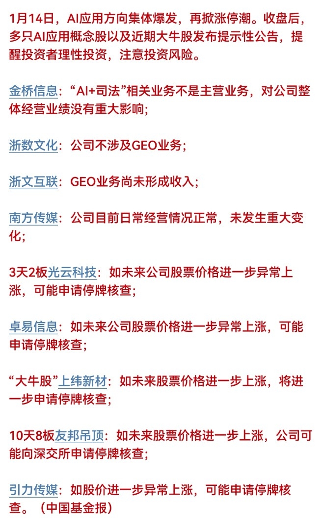 昨天中午也说了软件有个问题,就是昨天有9只票也进了监管,虽然说是300的票而且还是100%异动一般没有事的,但你这中午一降温,收盘竞价又有招商银行、中国平安、恒瑞医药、茅台、长江电力等等基本各板块大市值龙头加起来有100多亿的巨额压单。打压目的明显!监管晚上肯定配合加强!晚上果然AI应用多家公司都出现了澄清、停牌威胁!有些直接停牌了,大家自己看下图吧!我也不想一个个说了!反正整体意思大家都懂!那就休息吧!